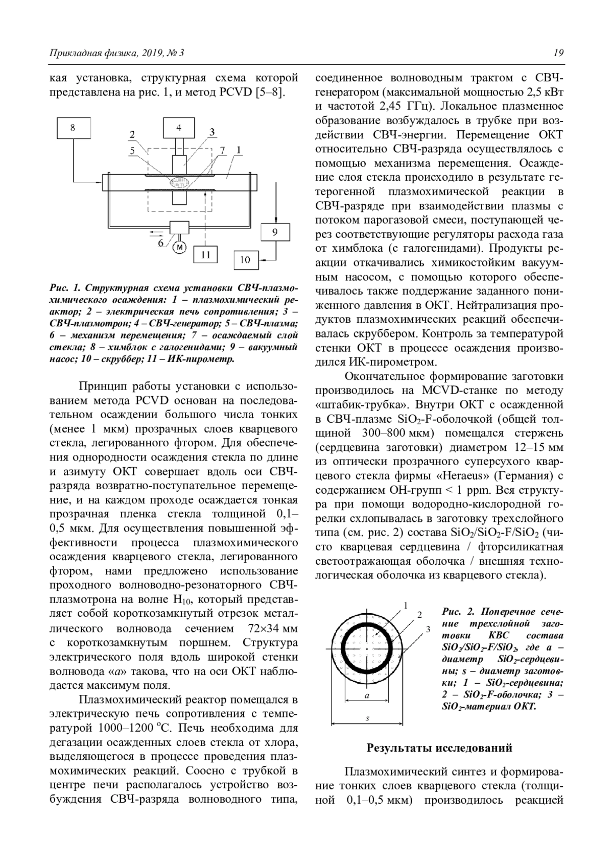 The results of experimental studies on the fabrication of high numerical quartz fiberoptic light guides preforms (with a high fluorine content (up to 7 wt. %) and a thickened cladding of quartz glass doped with fluorine) by nonisothermal plasma of resonance local microwave discharge (PCVD method) are given. It is shown that by using a nonisothermal plasma of resonance local microwave discharge at low pressure, it is possible to achieve high deposition rates of fluorine doped quartz glass layers (up to 3 μm/min) and the s/a ratio (where s – preform diameter, a – core diameter) at level 1.3–1.4 and higher. That discharge type, which provides an increased efficiency of a microwave plasma-chemical deposition process, was formed using the waveguide-resonator microwave plasmatron on the H10 wave. It should also be noted that in this case the process of fluorinated reflecting cladding deposition occurs at lower temperatures of the quartz support tube wall (1000–1100 oС) than in the case of a pure quartz glass deposition. The presence of cracks in the SiO2-F-film is not observed even at considerable thicknesses.