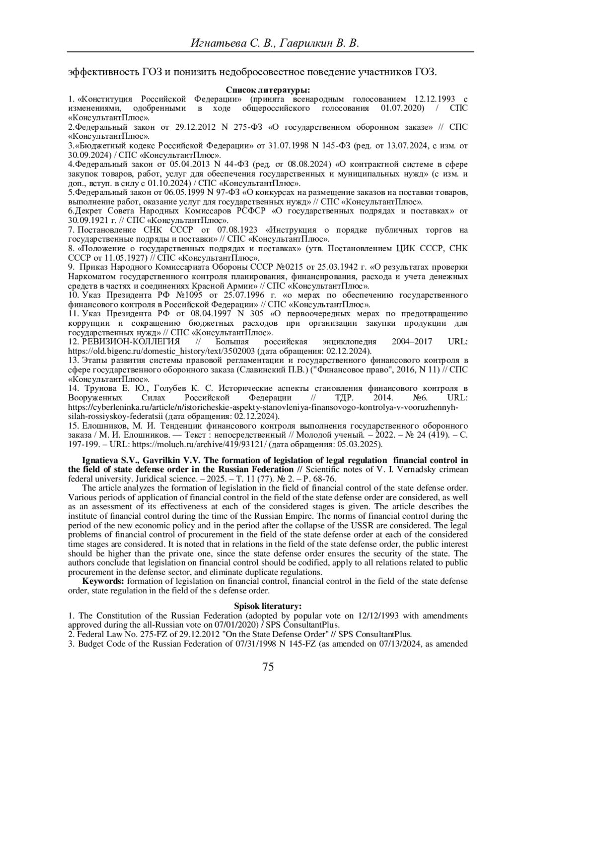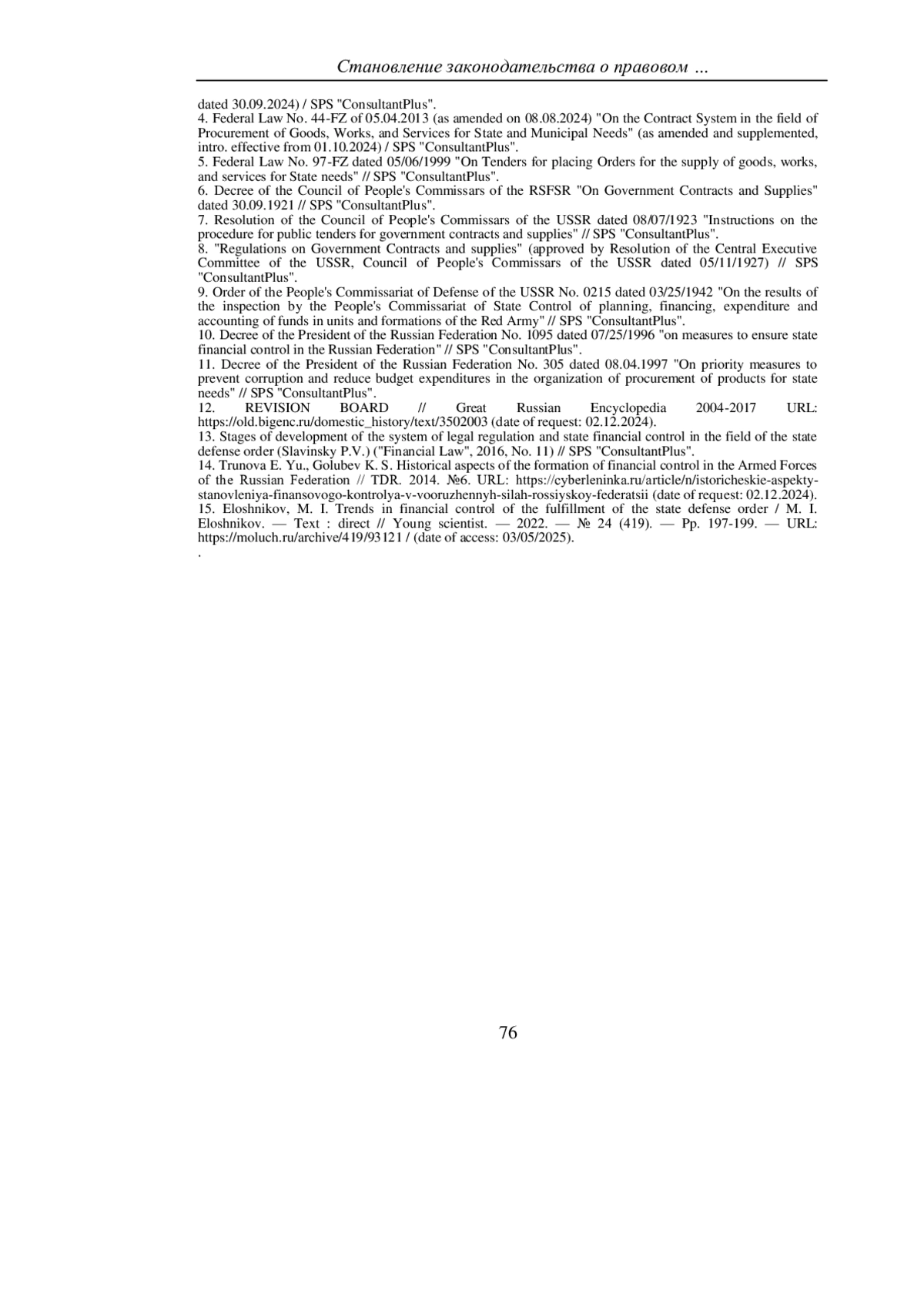 15. Елошников, М. И. Тенденции финансового контроля выполнения государственного оборонного заказа / М. И. Елошников. - Текст: непосредственный // Молодой ученый. - 2022. - № 24 (419). - С. 197-199. - URL: https://moluch.ru/archive/419/93121/ (дата обращения: 05.03.2025). EDN: LLGJXP