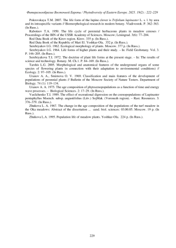 На примере национального парка «Марий Чодра» изучены 12 ценопопуляций (ЦП) Trifolium lupinaster. Все ЦП нормальные неполночленные. В спектрах большинства ЦП максимум приходится на растения генеративного периода. Средняя плотность особей в ЦП составляет 3,3 шт/м2. Вызывают опасение невысокие индексы восстановления и замещения, поскольку они свидетельствуют о незначительном возобновлении особей. В растительных сообществах с участием T. lupinaster выявлено 46 видов растений, относящихся к 22 семействам. Флористическое богатство колеблется от шести до 13 видов. Видовая насыщенность варьирует от 0,6 до 9,0 видов на м2. В ЦП преобладают длиннокорневищные травянистые растения (27,3 %). Среди эколого-ценотических ведущую роль играют виды лугово-степной (подгруппа влажных лугов (27 %) и боровой опушечной групп, образованная видами разреженных сосновых лесов (22 %).