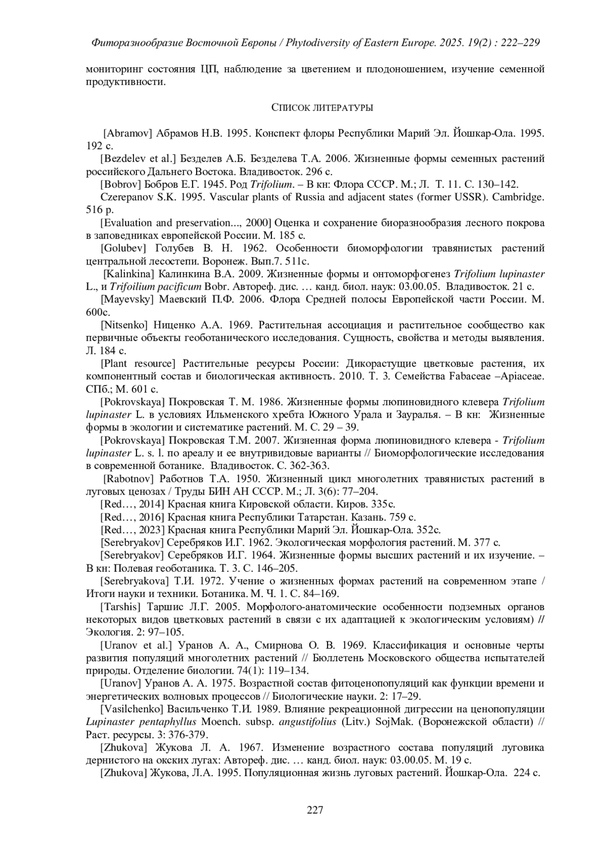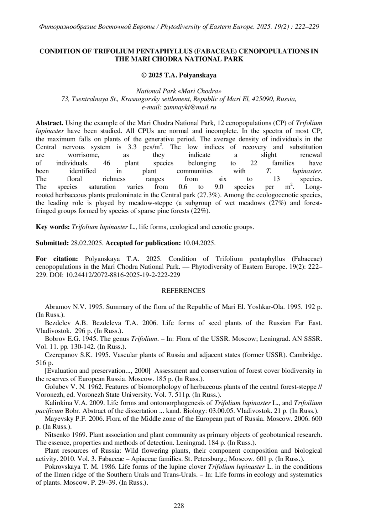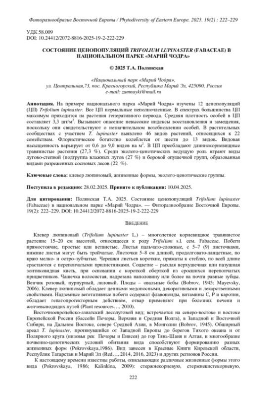 ПОЛЯНСКАЯ Т.А. СОСТОЯНИЕ ЦЕНОПОПУЛЯЦИЙ TRIFOLIUM LUPINASTER (FABACEAE) В НАЦИОНАЛЬНОМ ПАРКЕ «МАРИЙ ЧОДРА» // ФИТОРАЗНООБРАЗИЕ ВОСТОЧНОЙ ЕВРОПЫ. 2025. Т. 19 № 2