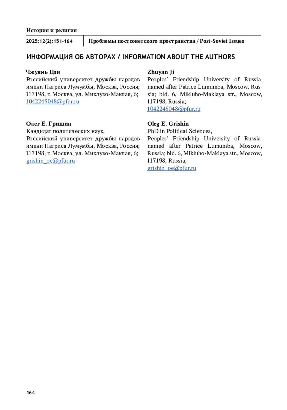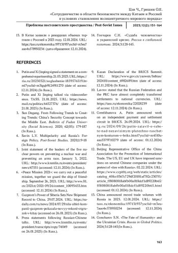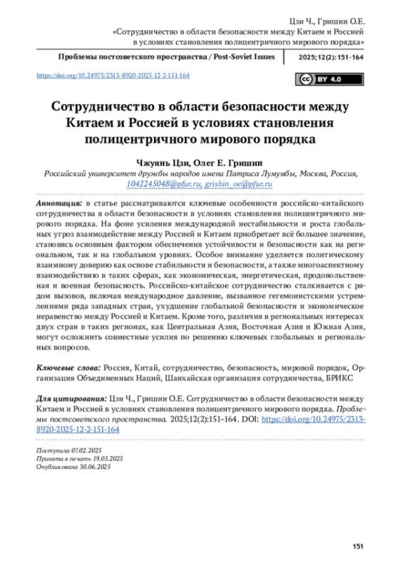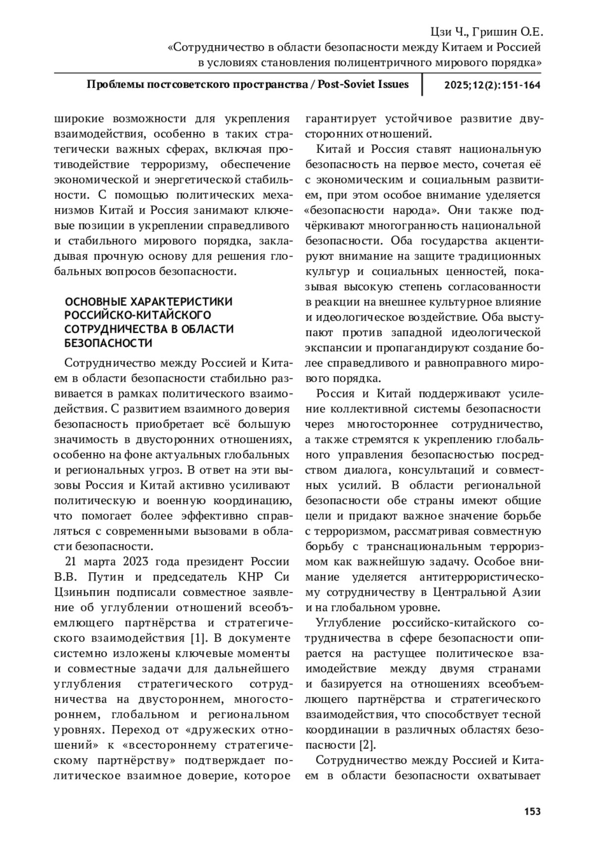 ЦЗИ Ч., ГРИШИН О. Е. СОТРУДНИЧЕСТВО В ОБЛАСТИ БЕЗОПАСНОСТИ МЕЖДУ КИТАЕМ И РОССИЕЙ В УСЛОВИЯХ СТАНОВЛЕНИЯ ПОЛИЦЕНТРИЧНОГО МИРОВОГО ПОРЯДКА // ПРОБЛЕМЫ ПОСТСОВЕТСКОГО ПРОСТРАНСТВА. 2025. ТОМ 12, № 2