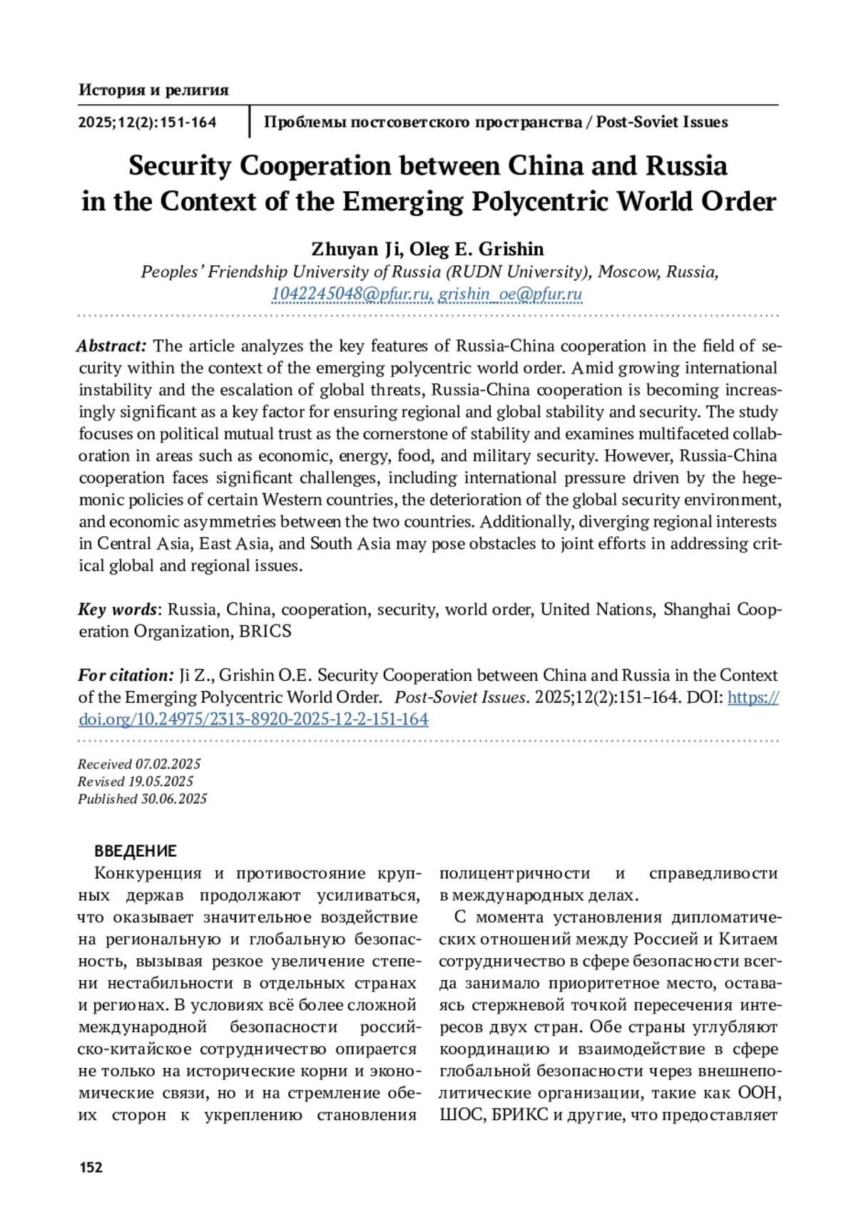 Статья: Сотрудничество в области безопасности между Китаем и Россией в условиях становления полицентричного мирового порядка (2025)
