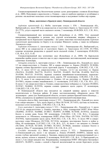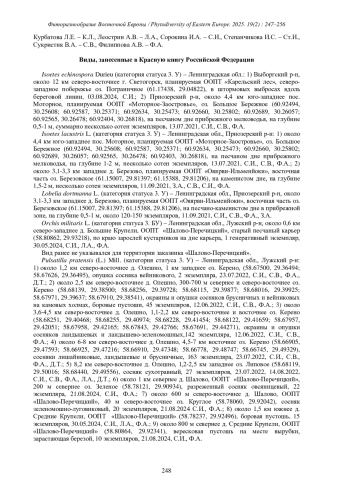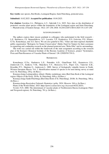 В период с 2021 по 2024 г. авторами статьи в ходе полевых работ, связанных с ведением региональных Красных книг, а также при инвентаризации флор планируемых к созданию особо охраняемых территорий (ООПТ) были получены новые сведения о распространении 32 охраняемых видов сосудистых растений.