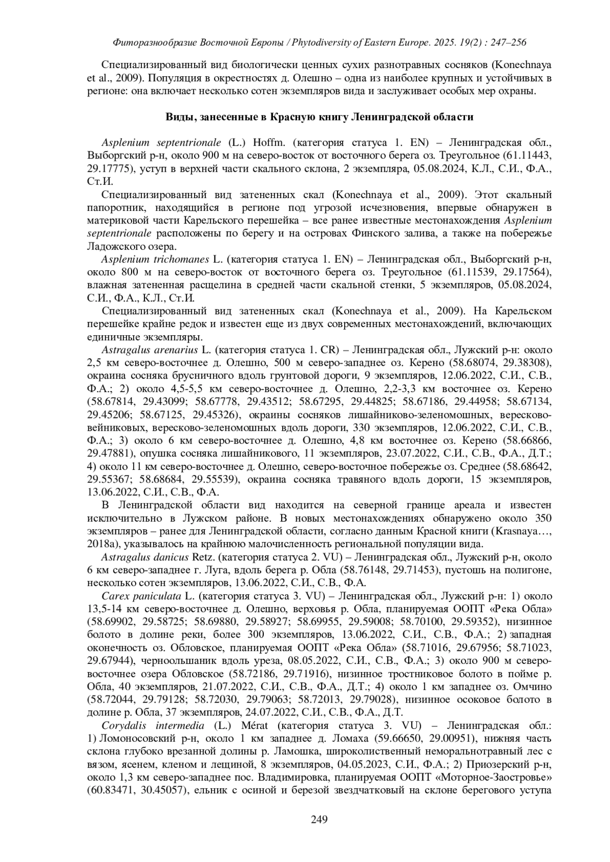 Статья содержит сведения о новых местонахождениях 32 охраняемых видов сосудистых растений. Из них 5 видов занесены в Красную книгу Российской Федерации, 23 - в Красную книгу Ленинградской области, 4 вида - в Красную книгу Санкт-Петербурга. Охраняемый вид Corydalis intermedia впервые выявлен в границах Ломоносовского района Ленинградской области; исчезающий в регионе вид Asplenium septentrionale ранее не был известен для материковой части Карельского перешейка. На основании полученных данных в целях сохранения комплексов редких и уязвимых видов сосудистых растений рекомендовано скорейшее создание в Ленинградской области заказников «Кузнечное», «Моторное-Заостровье», «Ояярви-Ильменйоки» и «Река Обла», а также планирование новой охраняемой территории в окрестностях оз. Треугольное.