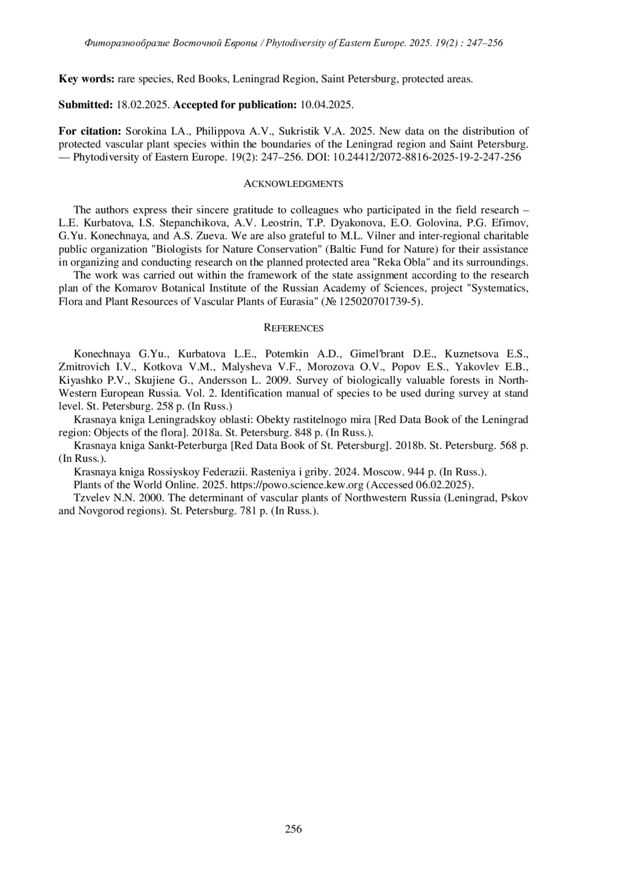 1. [Konechnaya et al.] Конечная Г.Ю., Курбатова Л.Е., Потемкин А.Д., Гимельбрант Д.Е., Кузнецова Е.С., Змитрович И.В., Коткова В.М., Малышева В.Ф., Морозова О.В., Попов Е.С., Яковлев Е.Б., Кияшко П.В., Skujiene G., Andersson L. 2009. Выявление и обследование биологически ценных лесов на Северо-Западе Европейской части России. Т. 2. Пособие по определению видов, используемых при обследовании на уровне выделов. СПб. 258 с. EDN: SHANJR