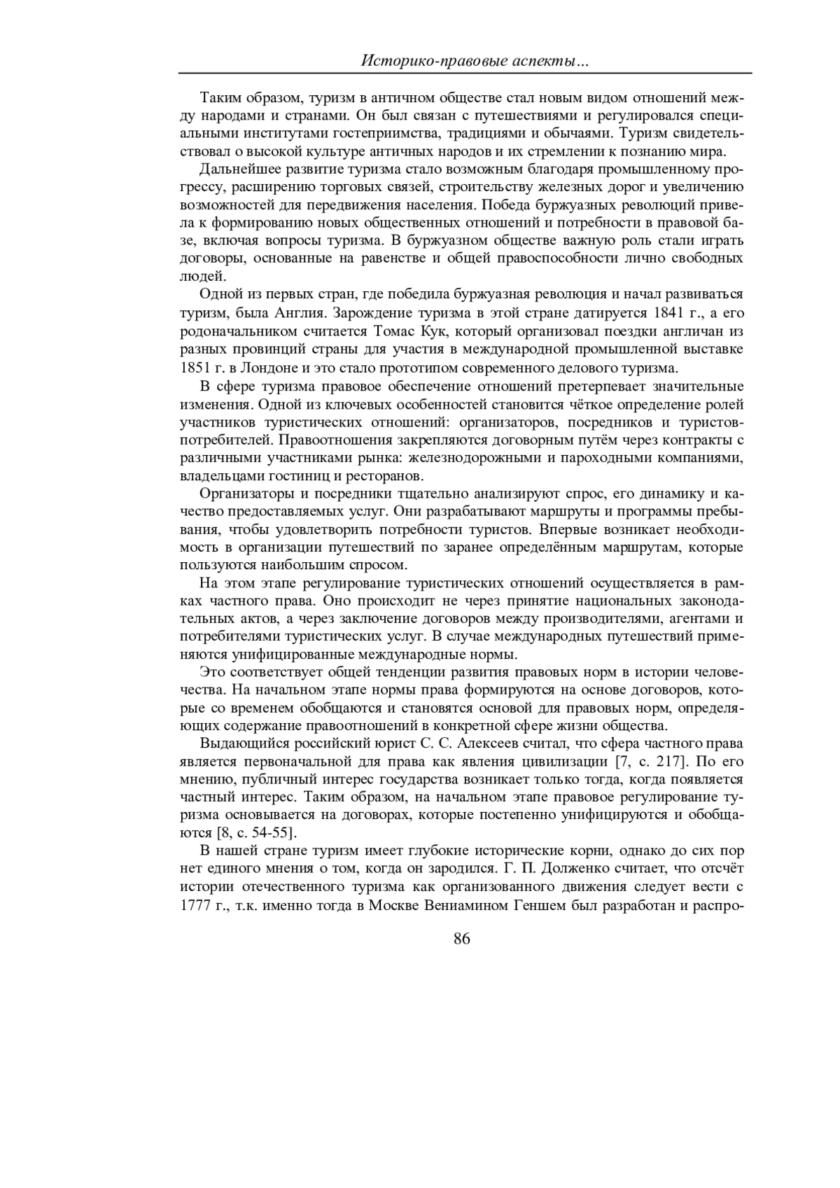 В статье исследуется эволюция туризма и его правовое регулирование с древних времён до 1980 г. Рассматривается зарождение и развитие институтов гостеприимства в античности, а также влияние колониальных завоеваний и географических открытий на формирование туризма. Особое внимание уделяется роли промышленного прогресса, расширения торговых связей и строительства железных дорог в развитии туризма в XIX в. Также анализируется зарождение организованного туризма в Англии, вклад отдельных ученых в создание туристической индустрии и особенности правового обеспечения туристических отношений в буржуазном обществе, включая договоры и классификацию участников. Отдельное внимание уделено вопросу развития туризма и его правовому регулированию в России до 1980 г., в частности, детально рассматривается советский периоду и роль государства в развитии указанной сферы, выделяя различные исторические этапы и их влияние на формирование соответствующего законодательства. Результаты исследования позволили выявить ключевые факторы и закономерности, способствовавшие формированию законодательства о туризме, а значимость - заключается в возможности использования полученных результатов для оценки влияния исторических и правовых факторов на современное состояние, а также для дальнейшего изучения истории и права в области туризма.