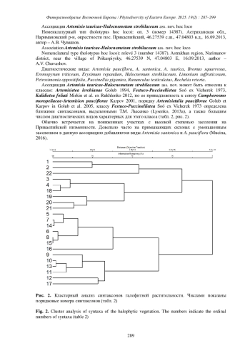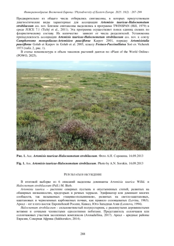 При анализе 314 геоботанических описаний, сделанных в экспедиции 2013 г., выделена группа с доминированием Artemisia taurica и Halocnemum strobilaceum из окрестностей поселка Прикаспийский Наримановского района Астраханской области. Описана новая ассоциация Artemisio tauricae-Halocnemetum strobilaceum ass. nov. в Нижнем Поволжье.