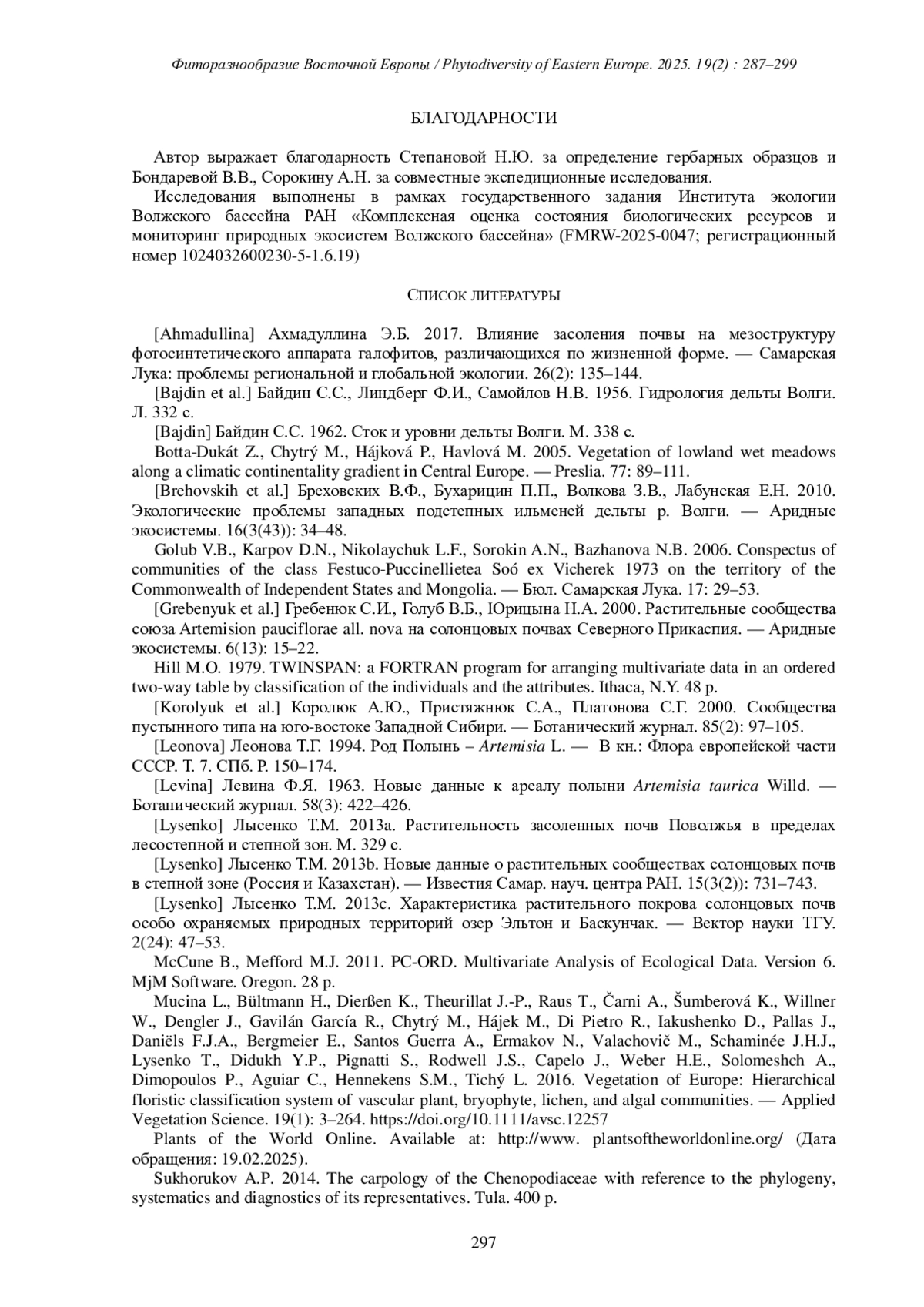 16. Mucina L., Bültmann H., Dierßen K., Theurillat J.-P., Raus T., Čarni A., Šumberová K., Willner W., Dengler J., Gavilán García R., Chytrý M., Hájek M., Di Pietro R., Iakushenko D., Pallas J., Daniëls F.J.A., Bergmeier E., Santos Guerra A., Ermakov N., Valachovič M., Schaminée J.H.J., Lysenko T., Didukh Y.P., Pignatti S., Rodwell J.S., Capelo J., Weber H.E., Solomeshch A., Dimopoulos P., Aguiar C., Hennekens S.M., Tichý L. 2016. Vegetation of Europe: Hierarchical floristic classification system of vascular plant, bryophyte, lichen, and algal communities. - Applied Vegetation Science. 19(1): 3-264. 10.1111/avsc.12257 Plants of the World Online. Available at: http://www.plantsoftheworldonline.org/(Дата обращения: 19.02.2025). DOI: 10.1111/avsc.12257PlantsoftheWorldOnline.Availableat EDN: XLIMMN