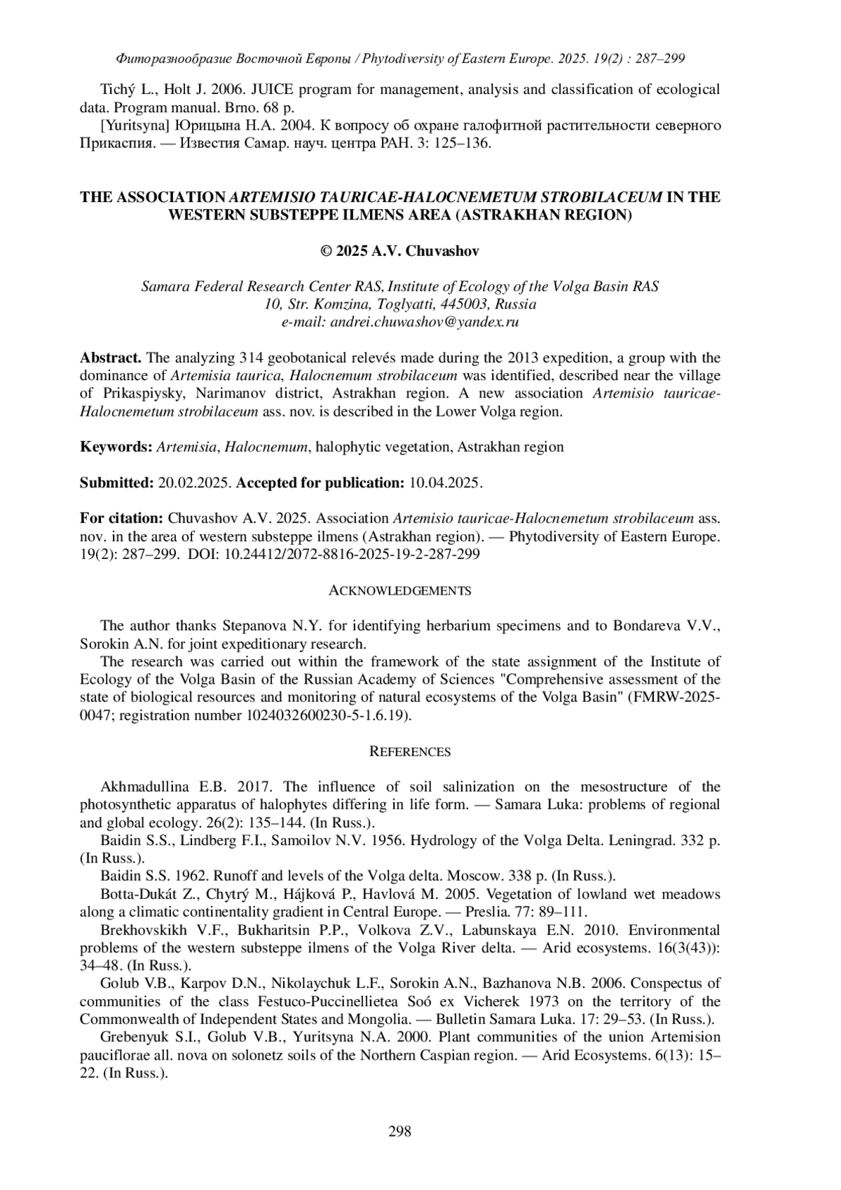 19. [Yuritsyna] Юрицына Н.А. 2004. К вопросу об охране галофитной растительности северного Прикаспия. - Известия Самар. науч. центра РАН. 3: 125-136.