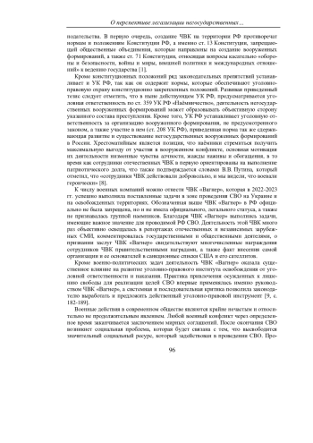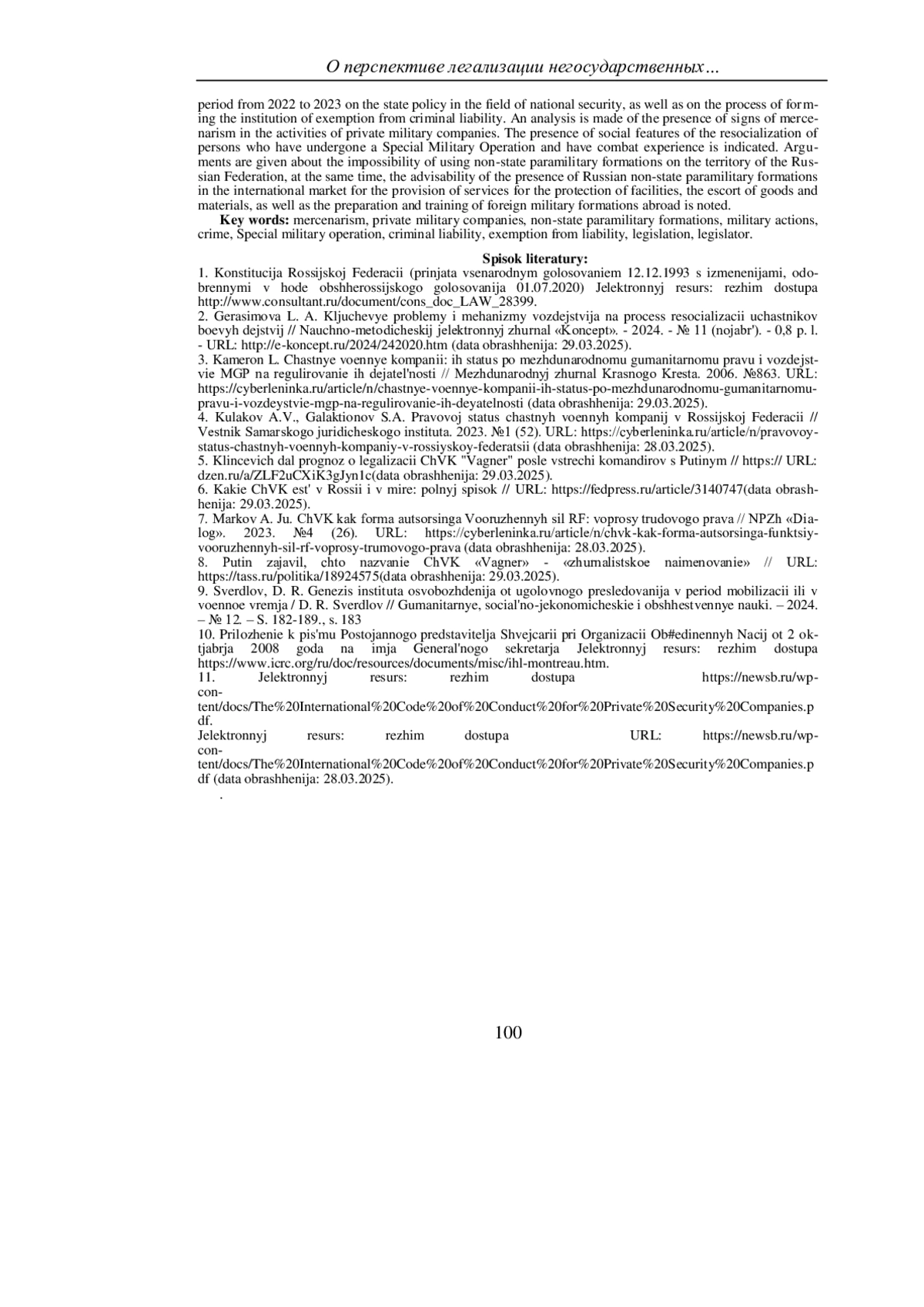 4. Кулаков А.В., Галактионов С.А. Правовой статус частных военных компаний в Российской Федерации // Вестник Самарского юридического института. 2023. №1 (52). URL: https://cyberleninka.ru/article/n/pravovoy-status-chastnyh-voennyh-kompaniy-v-rossiyskoy-federatsii (дата обращения: 28.03.2025). EDN: GTMIPF
