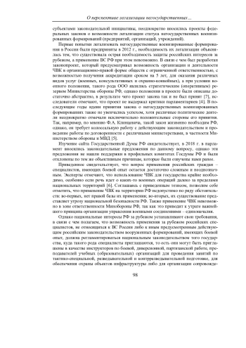 Вопрос легализации негосударственных военизированных формирований в Рос сии, которые с подачи журналистов принято именовать частными военными компаниями (далее - ЧВК) на сегодняшний день не разрешен, представляется, что на данный момент его законодательное разрешение поставлено на паузу.