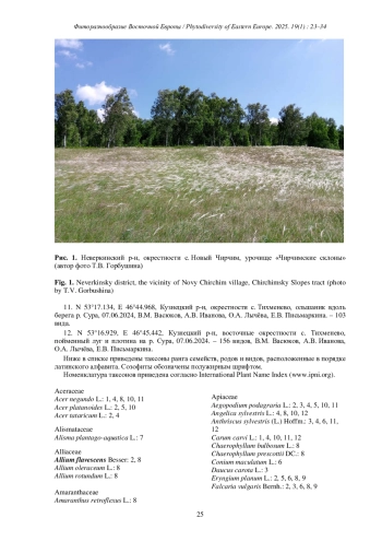В начале июня 2024 г. в результате флористических исследований в 12 пунктах в Камешкирском, Кузнецком, Неверкинском и Пензенском районах Пензенской области выявлено 584 вида сосудистых растений. К числу редких растений, нуждающихся в охране, отнесено 29 видов, из них 3 вида занесены в Красную книгу Российской Федерации (Red…, 2024): Iris aphylla L., Stipapulcherrima K. Koch, Stipa rubens P. A. Smirn. [ S. zalesskii auct. p. p.] и 28 видов - в Красную книгу Пензенской области (Red…, 2024): Adonanthe vernalis (L.) Spach, Allium flavescens Besser, Amygdalus nana L., Aster amellus L., Astragalus varius S. G. Gmel., Carex hartmaniorum Cajander, Dianthus volgicus Juz., Ephedra distachya L., Gagea erubescens ( Besser) Schult. et Schult. f., Galatella villosa (L.) Rchb. f., Gentiana pneumonanthe L., Gladiolus tenuis M. Bieb., Gratiola officinalis L., Iris aphylla L., Jacobaea fluviatilis (Wallr.) E. Wiebe, Lilium pilosiuscum (Freyn) Miscz., Pentanema germanicum (L.) D. Gut. Larr., Santos-Vicente, Anderb., E. Rico et M. M. Mart. Ort., Potentilla alba L., Pseudopodospermum tauricum (M. Bieb.) Vasjukov et Saksonov, Pulsatilla patens (L.) Mill., Salix rosmarinifolia L., Spiraea crenata L., Stipa borysthenica Klokov ex Prokudin, Stipa pennata L., Stipa pulcherrima K. Koch, Stipa rubens P. A. Smirn. [ S. zalesskii auct. p. p.], Stipa tirsa Steven, Trinia multicaulis (Poir.) Schischk. Предложено к организации на региональном уровне три особо охраняемых природных территории.