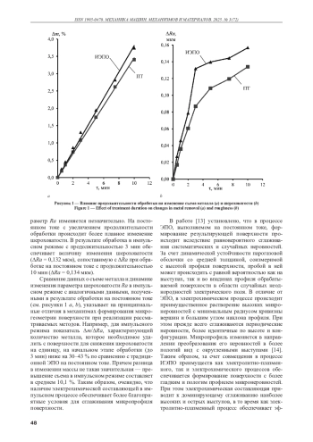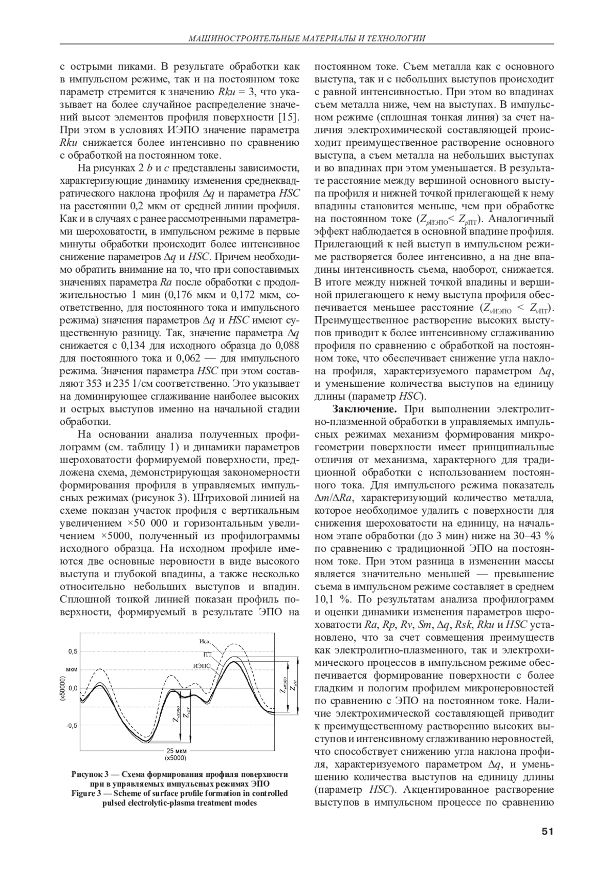 Для повышения эффективности методов электролитно-плазменной обработки разработаны режимы, основанные на использовании управляемых импульсов. Режимы реализуются за счет чередования импульсов высокого напряжения, соответствующего электролитно-плазменной области, и бестоковых пауз между ними. В начальный момент включения импульса высокого напряжения действует электрохимический процесс (в стадии формирования парогазовой оболочки). Повышение эффективности импульсного процесса достигается за счет интенсивного съема металла при протекании электрохимического процесса и оптимизации продолжительности электролитно-плазменного процесса, при котором обеспечивается высокое качество поверхности. По результатам исследований установлено, что разработанный импульсный метод за счет совмещения преимуществ как электролитно-плазменного, так и электрохимического процессов обеспечивает формирование поверхности с более гладким и пологим профилем микронеровностей по сравнению с традиционной электролитно-плазменной обработкой на постоянном токе. Наличие электрохимической составляющей приводит к преимущественному растворению высоких выступов и интенсивному сглаживанию неровностей, что способствует снижению угла наклона профиля и уменьшению количества выступов на единицу длины (параметр HSC). Акцентированное растворение выступов в импульсном процессе, по сравнению с обработкой на постоянном токе, подтверждается динамикой изменения параметра Rsk, определяющего асимметричность профиля (преобладание выступов или впадин) — для импульсного режима параметр Rsk выше, что свидетельствует о более интенсивном сглаживании выступов.