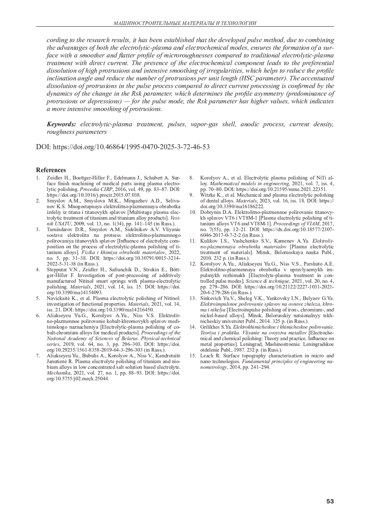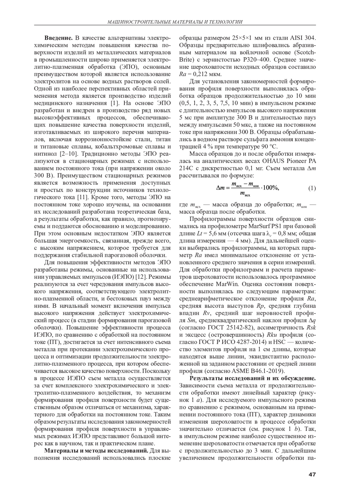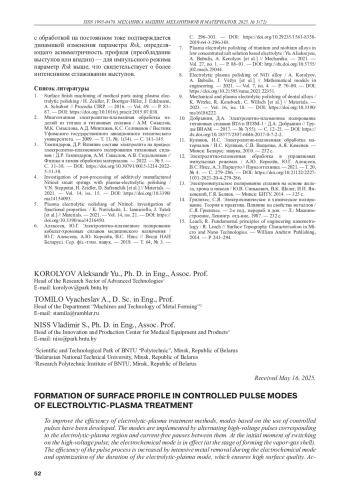 Статья: ФОРМИРОВАНИЕ ПРОФИЛЯ ПОВЕРХНОСТИ В УПРАВЛЯЕМЫХ ИМПУЛЬСНЫХ РЕЖИМАХ ЭЛЕКТРОЛИТНО-ПЛАЗМЕННОЙ ОБРАБОТКИ (2025)