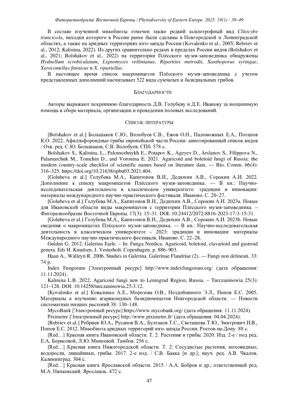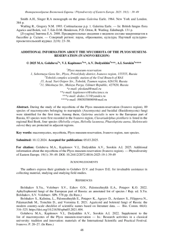 5. [Golubeva et al.] Голубева М.А., Капитонов В.И., Дедюхин А.В., Сорокин А.И. 2023b. Новые сведения о макромицетах Плёсского музея-заповедника. - В кн.: Научно-исследовательская деятельность в классическом университете - 2023: традиции и инновации: материалы Международного научно-практического фестиваля. Иваново. С. 22-28. EDN: CDBYTF