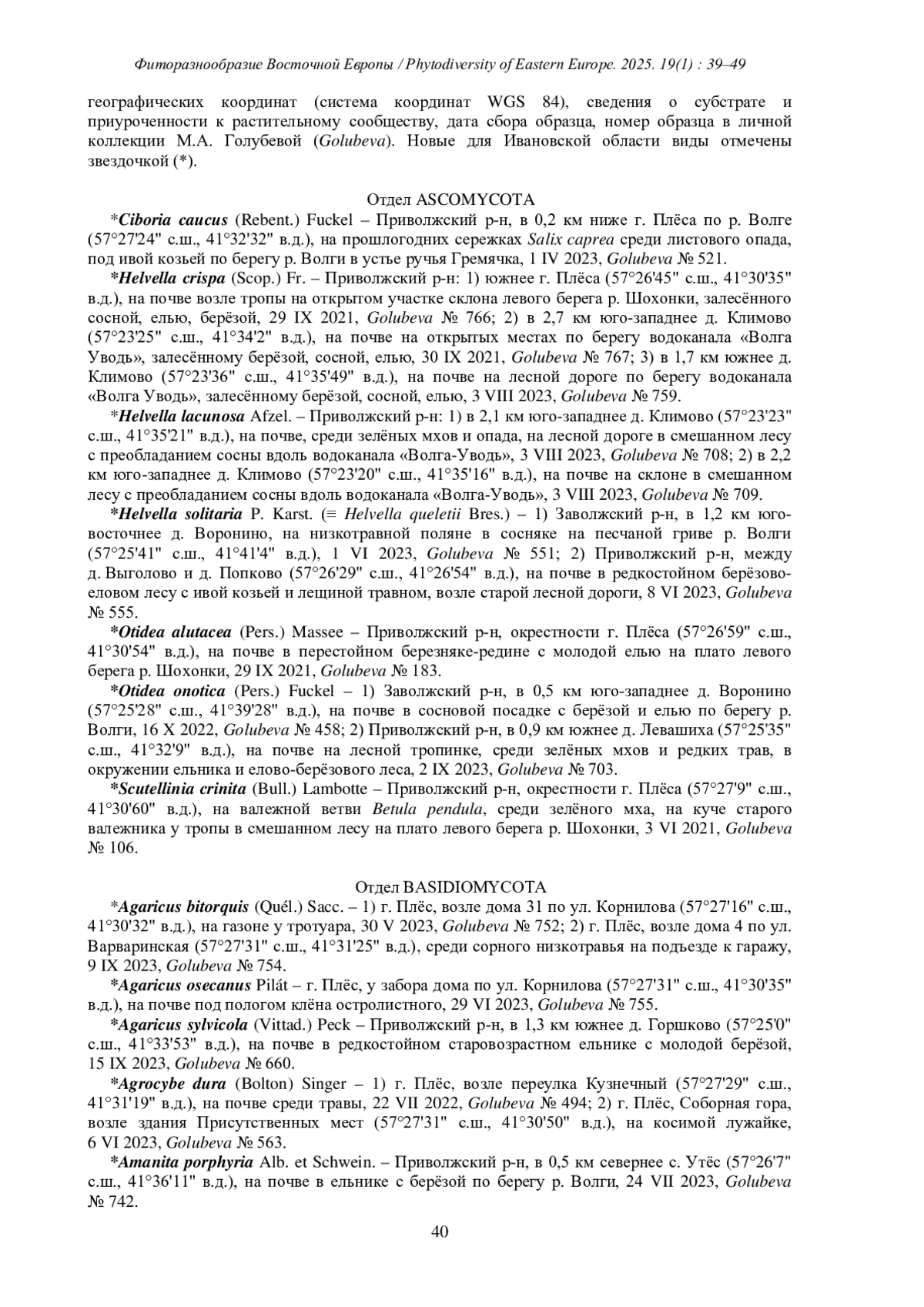 4. [Golubeva et al.] Голубева М.А., Капитонов В.И., Дедюхин А.В., Сорокин А.И. 2023a. Новые для Ивановской области виды макромицетов с территории Плёсского музея-заповедника. - Фиторазнообразие Восточной Европы. 17(3): 15-31. DOI: 10.24412/2072-8816-2023-17-3-15-31 EDN: JMYDGQ