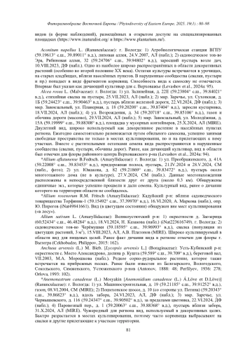 15. [Levashov et al.] Левашов А.Н., Жукова Н.Н., Романовский А.Ю., Комарова А.С., Филиппов Д.А. 2019. Находки редких и охраняемых сосудистых растений в вологодской части бассейна реки Вага. - Фиторазнообразие Восточной Европы. 13(3): 253-275. DOI: 10.24411/2072-8816-2019-10052 EDN: XGQVTJ