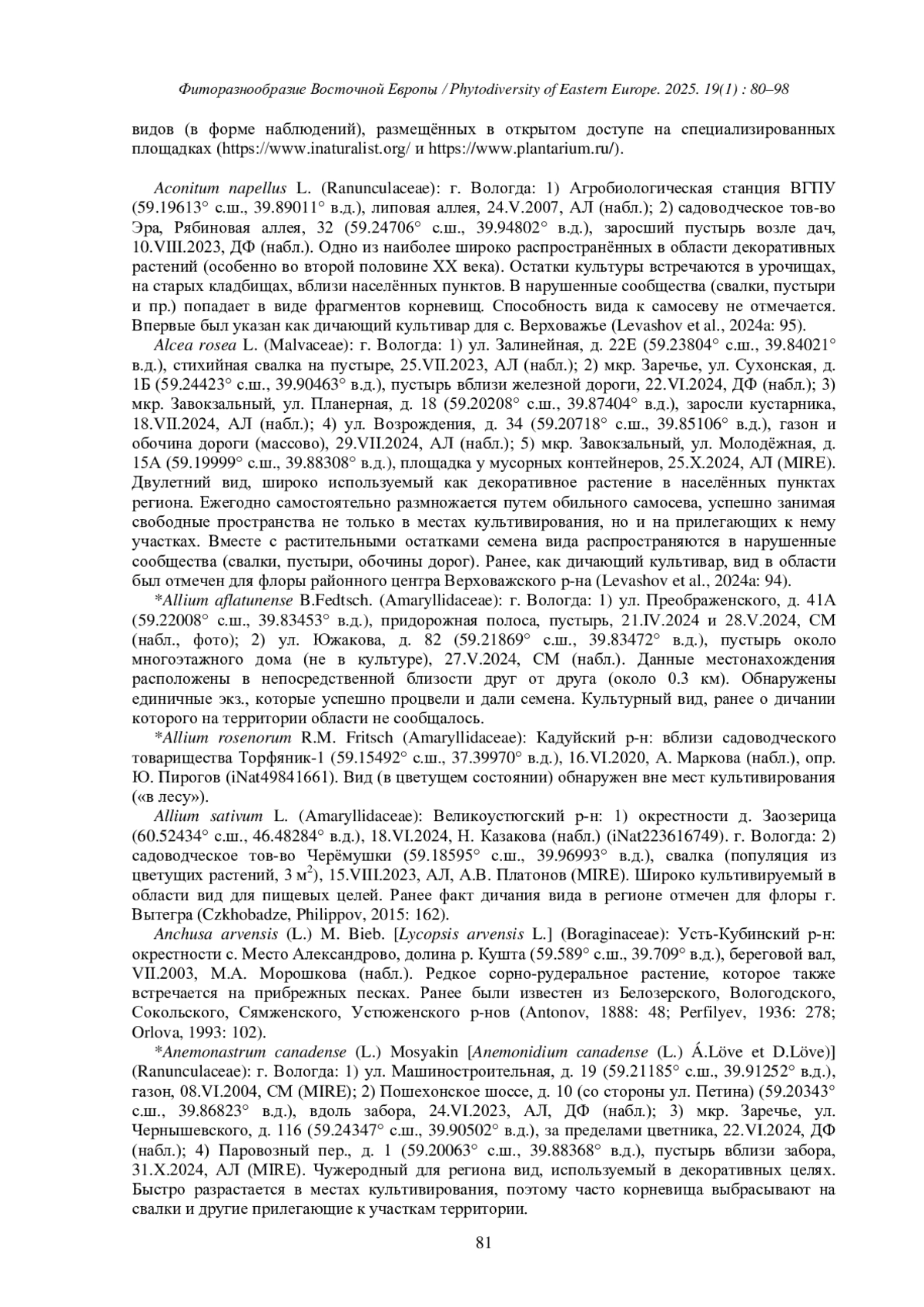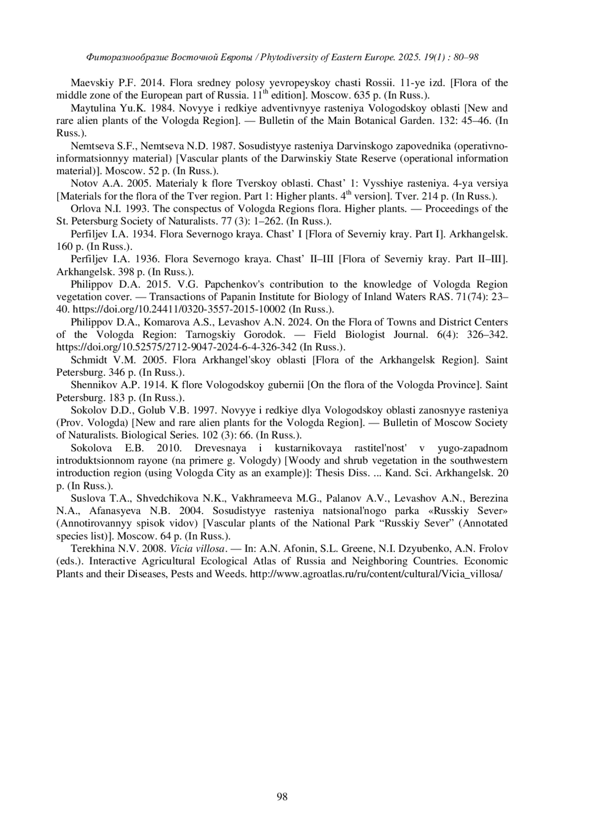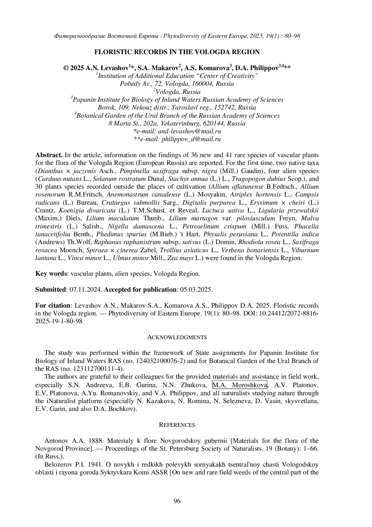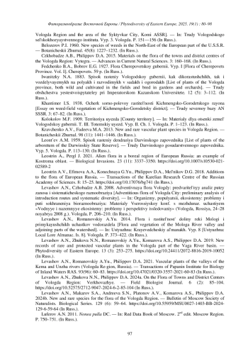 17. [Levashov et al.] Левашов А.Н., Жукова Н.Н., Филиппов Д.А. 2024a. К флоре малых городов и районных центров Вологодской области: Верховажье. - Полевой журнал биолога. 6 (2): 85-104. DOI: 10.52575/2712-9047-2024-6-2-85-104 EDN: LOXWYL