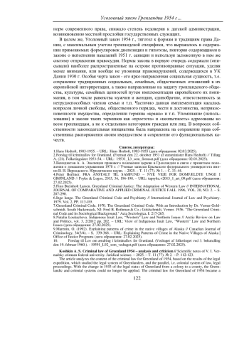 5. Finn Breinholt Larsen. Greenland Criminal Justice: The Adaptation of Western Law // INTERNATIONAL JOURNAL OF COMPARATIVE AND APPLIED CRIMINAL JUSTICE FALL 1996, VOL. 20, NO. 2. - S. 287-290.