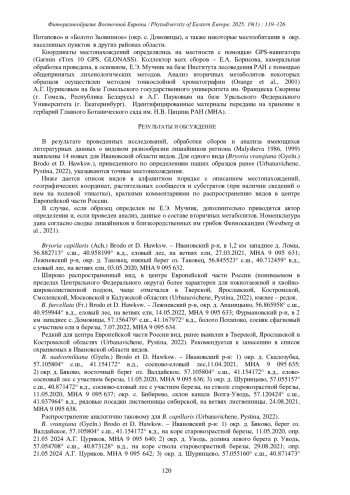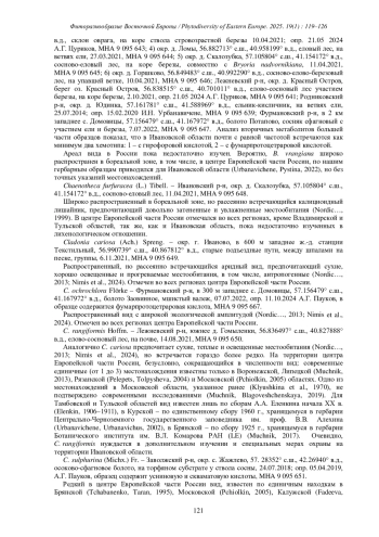 В результате проведенных исследований, обработки сборов и анализа имеющихся литературных данных о видовом разнообразии лишайников региона (Malysheva 1986, 1999) выявлены 14 новых для Ивановской области видов. Для одного вида (Bryoria vrangiana (Gyeln.) Brodo et D. Hawksw.), приведенного по определениям наших образцов ранее (Urbanavichene, Pystina, 2022), указываются точные местонахождения. Ниже дается список видов в алфавитном порядке с описанием местонахождений, географических координат, растительных сообществ и субстратов (при наличии сведений о нем на полевой этикетке), краткими комментариями по распространению видов в центре Европейской части России. В случае, если образец определен не Е. Э. Мучник, дополнительно приводится автор определения и, если проведен анализ, данные о составе вторичных метаболитов. Номенклатура дана согласно сводке лишайников и близкородственных им грибов Фенноскандии (Westberg et al., 2021).