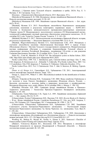 24. [Pelepets, Tolpysheva] Пелепец Н.В., Толпышева Т.Ю. 2004. Виды семейства Cladoniaceae и их экология в лесах Окского биосферного заповедника (Рязанская область, Россия). - Биология, систематика и экология грибов в природных экосистемах и агрофитоценозах. Материалы Междунар. науч. конф. (Минск, 20-24 сентября 2004 г.). Минск. С. 188-192.