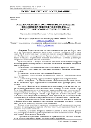 Цель исследования — раскрыть возможности применения ролевых игр как инструмента психопрофилактики контрзависимого поведения в коллективах менеджеров по продажам в индустрии красоты.