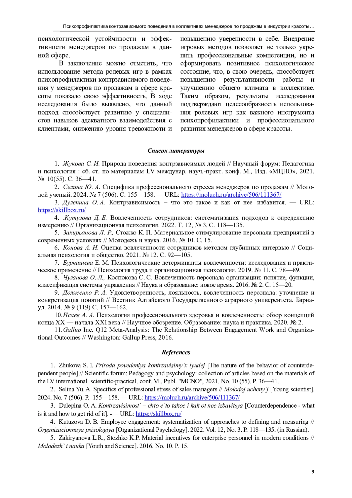 Выводы. Проведенное исследование подтвердило гипотезу о возможности эффектив-ной психопрофилактики контрзависимого поведения в коллективах менеджеров по продажам в индустрии красоты посредством метода ролевых игр.