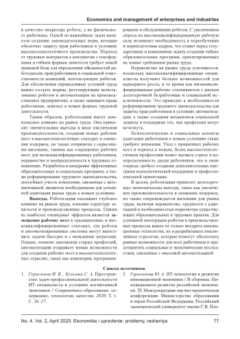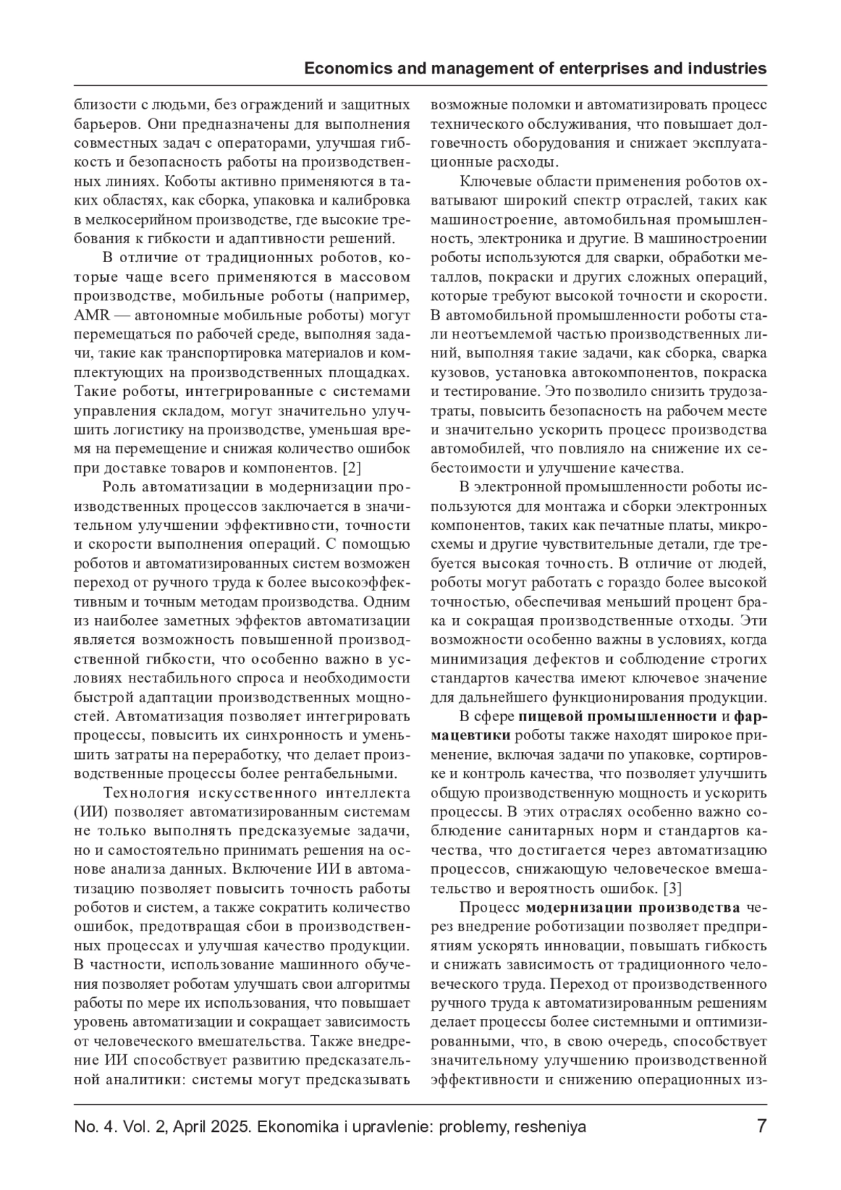 Роботизация производственных процессов оказывает значительное влияние на структуру затрат и рынок труда. В данной статье рассматривается, как автоматизация с использованием роботов способствует сокращению производственных затрат, повышению эффективности и качества продукции, одновременно изменяя потребности в рабочей силе. Также анализируются возможные экономические и социальные последствия внедрения роботов, включая снижение рабочих мест для низкоквалифицированных работников и создание новых возможностей для высококвалифицированных специалистов. Рассмотрены вызовы для государств и бизнеса в адаптации к изменяющемуся рынку труда, а также необходимость в переподготовке работников и создании новых форм занятости в условиях высокотехнологичных изменений.