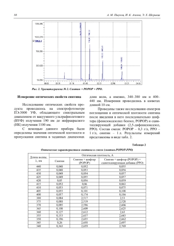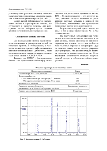 Полученные данные по составу, оптическим и люминесцентным свойствам продукта «синтин» позволяют предположить возможность использования данного образца в качестве материала при создании жидкого сцинтиллятора. Однако в связи с отсутствием сведений о радиоактивности данного материала, необходимо провести еще ряд исследований, связанных с определением содержания изотопа углерода 14С.