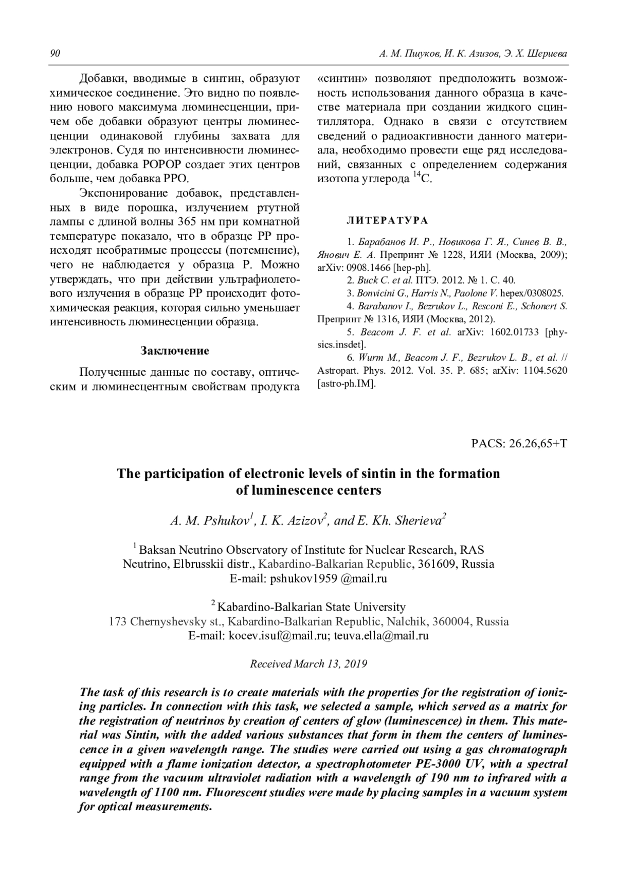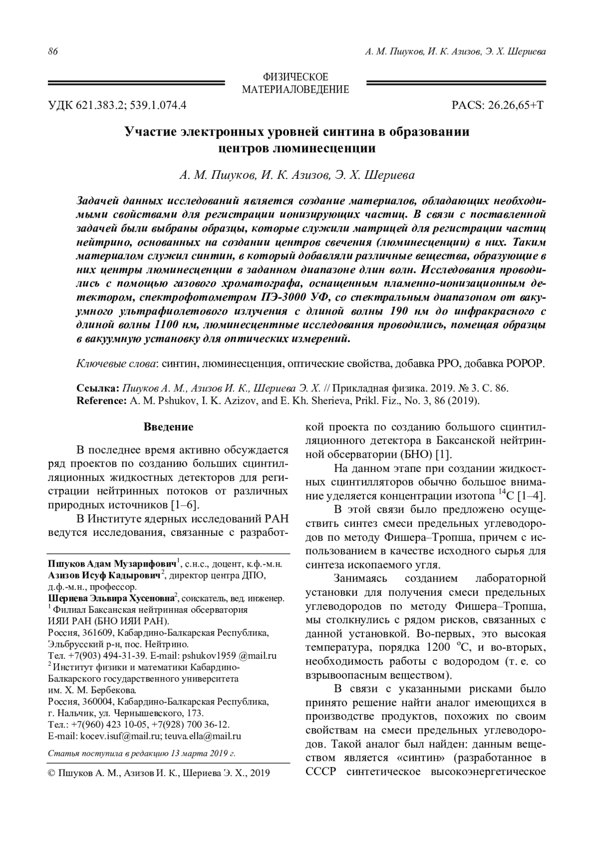 Пшуков А. М., Азизов И. К., Шериева Э. Х. Участие электронных уровней синтина в образовании центров люминесценции 86