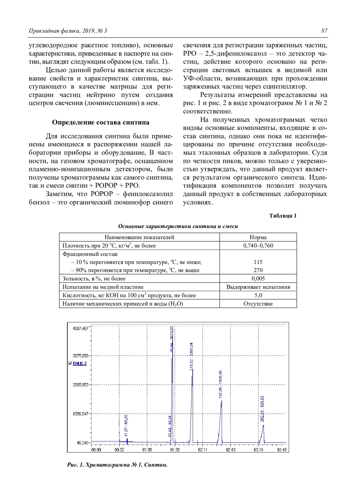 Задачей данных исследований является создание материалов, обладающих необходимыми свойствами для регистрации ионизирующих частиц. В связи с поставленной задачей были выбраны образцы, которые служили матрицей для регистрации частиц нейтрино, основанных на создании центров свечения (люминесценции) в них. Таким материалом служил синтин, в который добавляли различные вещества, образующие в них центры люминесценции в заданном диапазоне длин волн. Исследования проводились с помощью газового хроматографа, оснащенным пламенно-ионизационным детектором, спектрофотометром ПЭ-3000 УФ, со спектральным диапазоном от вакуумного ультрафиолетового излучения с длиной волны 190 нм до инфракрасного с длиной волны 1100 нм, люминесцентные исследования проводились, помещая образцы в вакуумную установку для оптических измерений.
