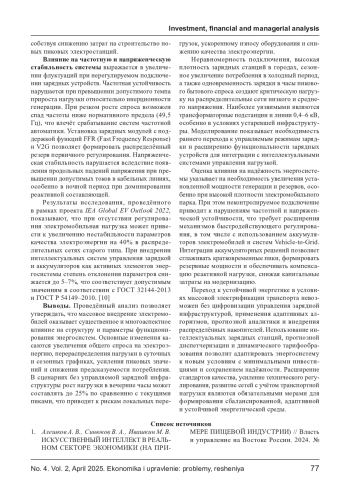 1. Алешков А. В., Синюков В. А., Ивашкин М. В. ИСКУССТВЕННЫЙ ИНТЕЛЛЕКТ В РЕАЛЬНОМ СЕКТОРЕ ЭКОНОМИКИ (НА ПРИМЕРЕ ПИЩЕВОЙ ИНДУСТРИИ) // Власть и управление на Востоке России. 2024. №(107). С. 51-63. (item.asp?id=67999220). EDN: LVZVTN