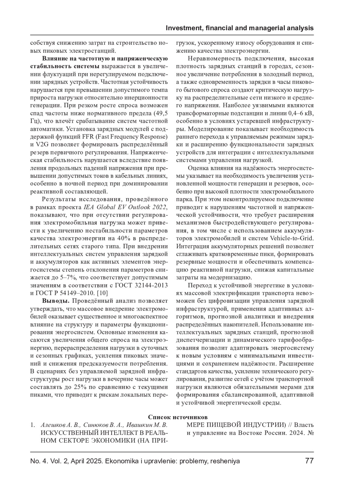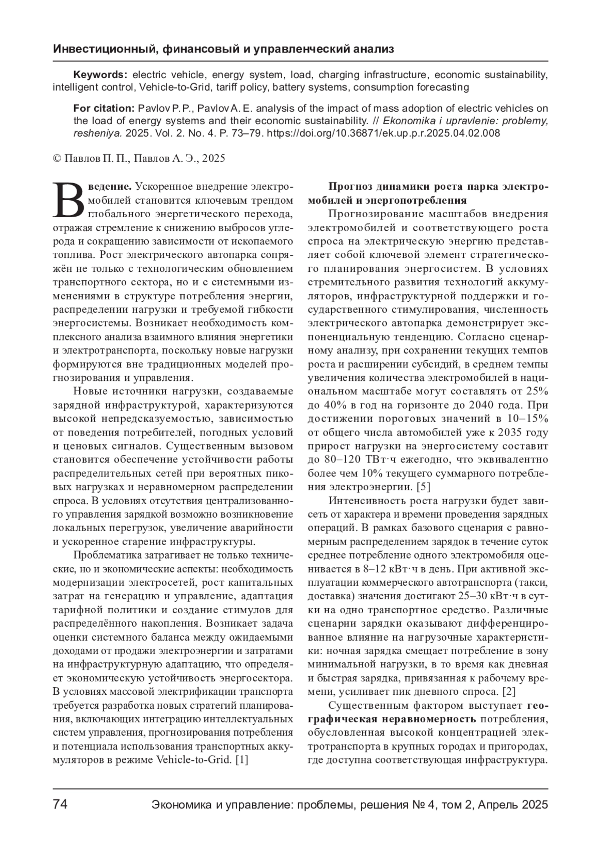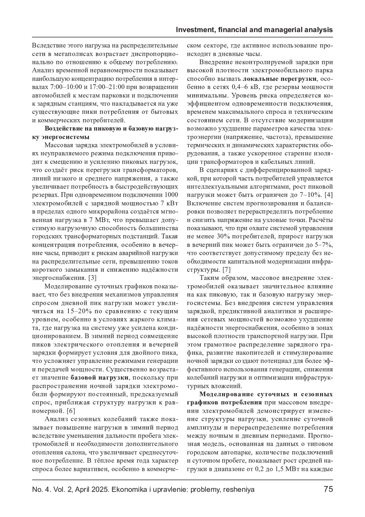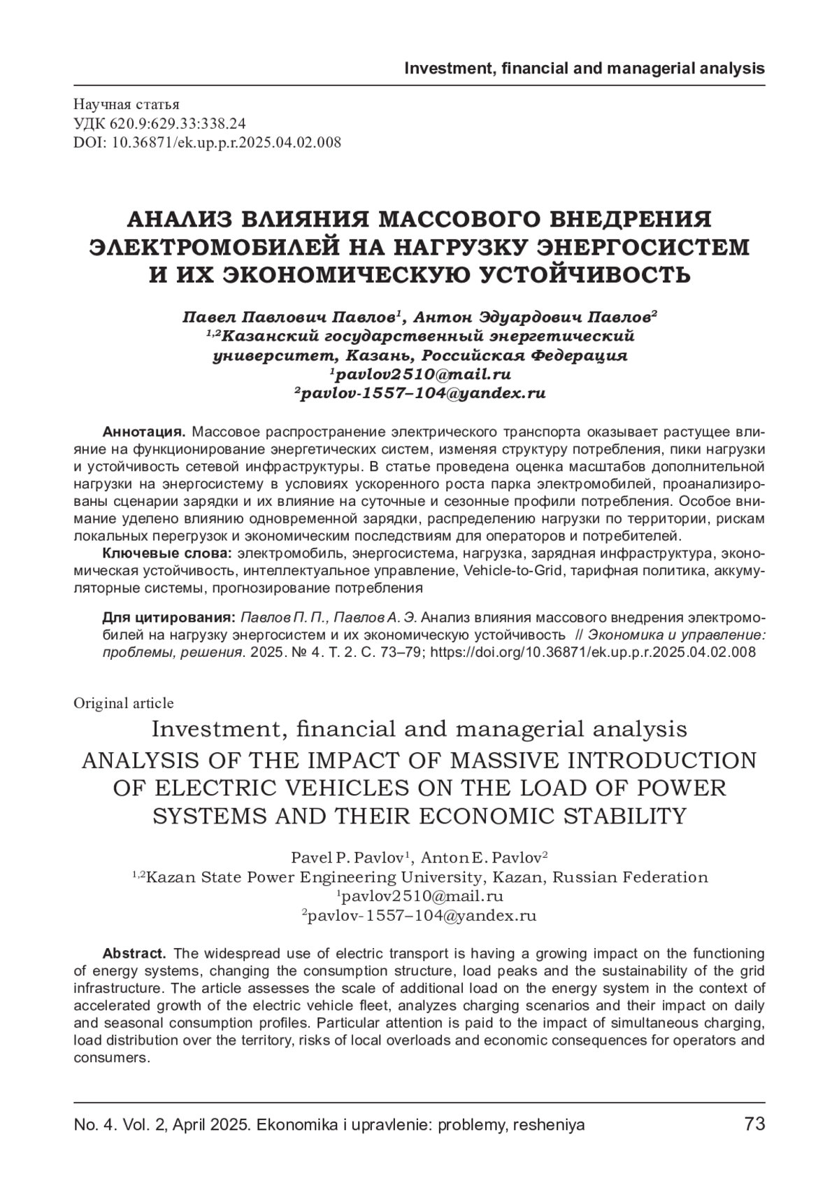 Массовое распространение электрического транспорта оказывает растущее влияние на функционирование энергетических систем, изменяя структуру потребления, пики нагрузки и устойчивость сетевой инфраструктуры. В статье проведена оценка масштабов дополнительной нагрузки на энергосистему в условиях ускоренного роста парка электромобилей, проанализированы сценарии зарядки и их влияние на суточные и сезонные профили потребления. Особое внимание уделено влиянию одновременной зарядки, распределению нагрузки по территории, рискам локальных перегрузок и экономическим последствиям для операторов и потребителей.