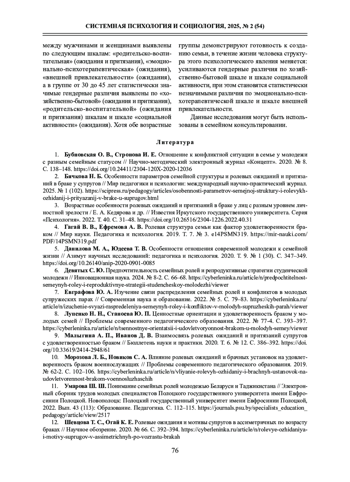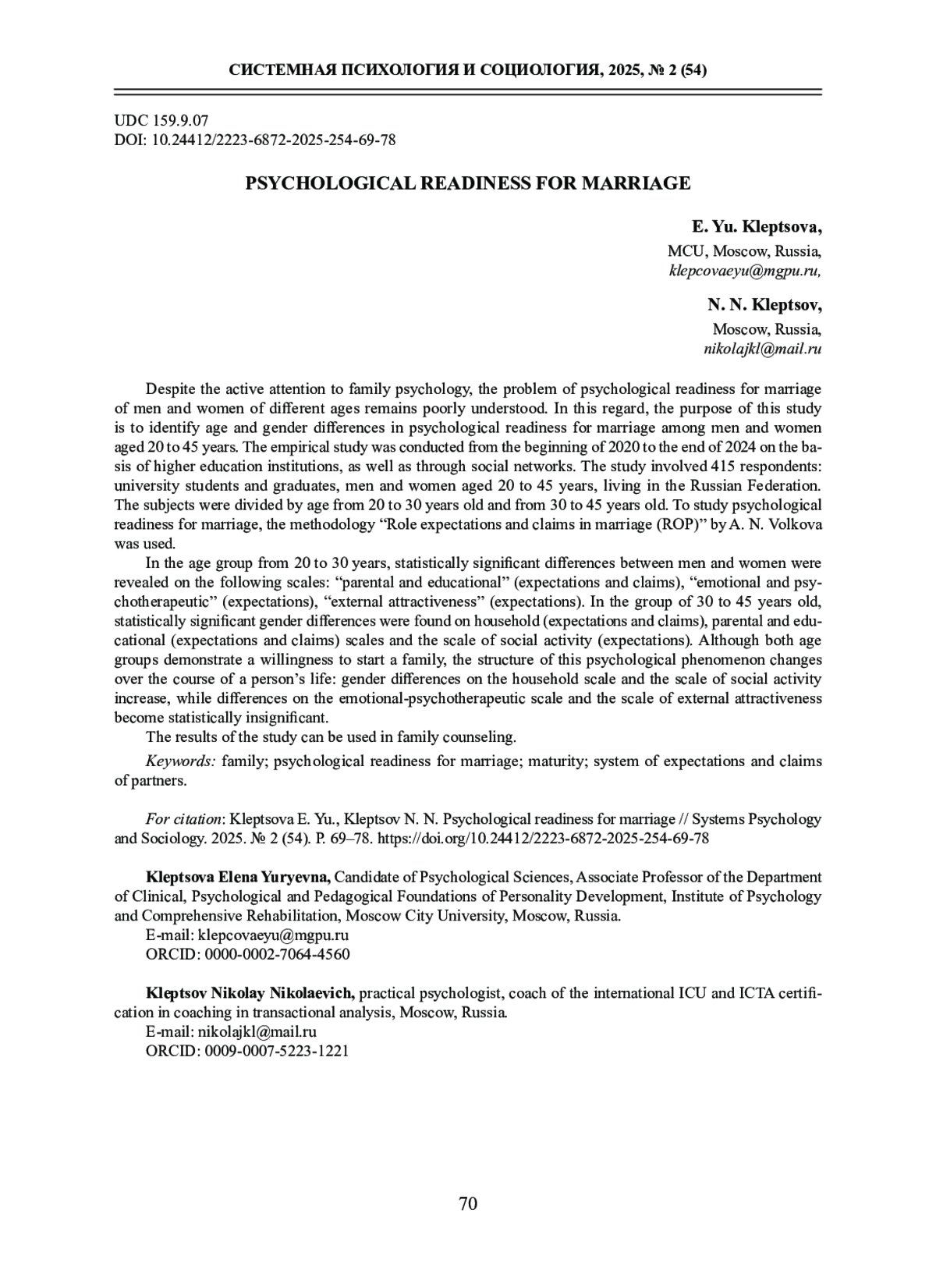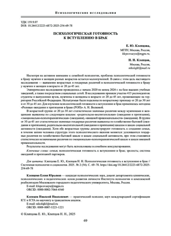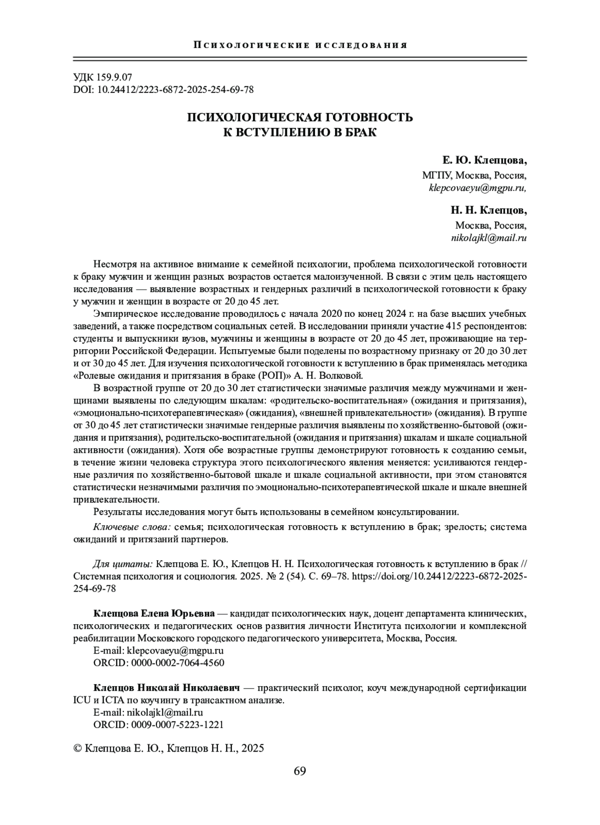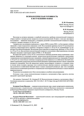 КЛЕПЦОВА Е. Ю., КЛЕПЦОВ Н. Н. ПСИХОЛОГИЧЕСКАЯ ГОТОВНОСТЬ К ВСТУПЛЕНИЮ В БРАК // СИСТЕМНАЯ ПСИХОЛОГИЯ И СОЦИОЛОГИЯ. 2025. № 2 (54)