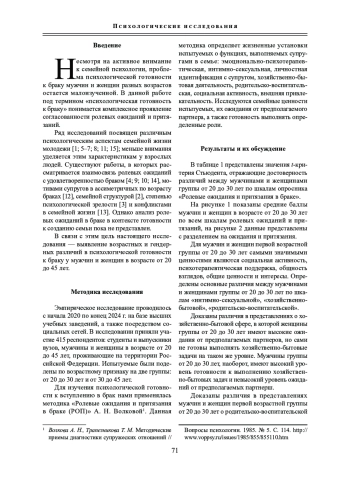 Несмотря на активное внимание к семейной психологии, проблема психологической готовности к браку мужчин и женщин разных возрастов остается малоизученной. В связи с этим цель настоящего исследования - выявление возрастных и гендерных различий в психологической готовности к браку у мужчин и женщин в возрасте от 20 до 45 лет.