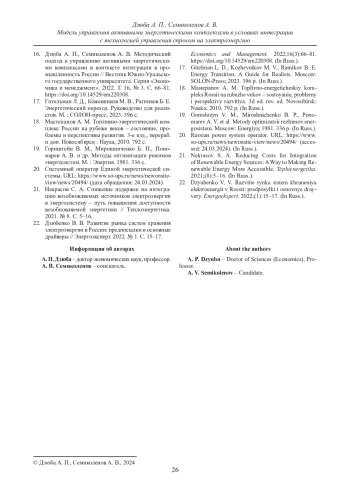 Статья посвящена разработке модели управления активными энергетическими комплексами, действующими на промышленных предприятиях и управляемых на основе механизмов интеграции с технологией управления спросом на электроэнергию. В материалах проводится анализ механизмов ценообразования на поставку электроэнергии по всем сегментам стоимости электроэнергии: стоимость электрической энергии, стоимость электрической мощности, стоимость услуг по передаче электроэнергии, формируемых с учетом неравномерности графиков спроса на потребление электроэнергии. Разработаны структуры факторов, влияющих на неравномерность спроса на потребление электроэнергии на промышленном предприятии, и структуры факторов, действующих на работу системы распределенной генерации, работающей на промышленном предприятии. На основе проведенного исследования особенностей ценообразования на поставку электроэнергии для промышленных предприятий, особенностей функционирования систем распределенной генерации, внешних и внутренних факторов, влияющих на их работы, разработана модель управления активными энергетическими комплексами в условиях интеграции с технологией управления спросом на электроэнергию. Особенностью разработанной модели является анализ обращения электроэнергии в двух основных направлениях: направление внутреннего спроса потребления электроэнергии промышленным предприятием, направление выработки электроэнергии системой распределенной генерации. На основе данных, полученных в результате анализа двух основных направлений моделирования, проводится моделирование сценариев потребления электроэнергии предприятием и выработки электроэнергии системой распределенной генерации в рамках системы активного энергетического комплекса.