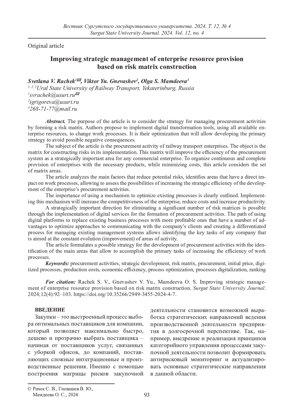 В статье проведен анализ основных факторов, позволяющих сократить возможные к возникновению риски, выделены направления, оказывающие непосредственное влияние на процессы работы, позволяющие оценить возможности повышения стратегической эффективности развития закупочной деятельности предприятия.