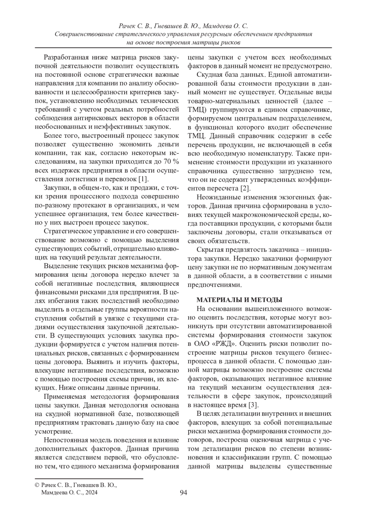 Предметом статьи является закупочная деятельность предприятий железнодорожного транспорта, объектом – матрица построения рисков при ее осуществлении. Данная матрица позволит повысить эффективность функционирования системы закупочной деятельности как стратегически важного направления для любого коммерческого предприятия. Совокупность направлений матрицы рассмотрена в статье в целях организации бесперебойного и комплектного обеспечения предприятий необходимой продукцией с учетом минимальных издержек.