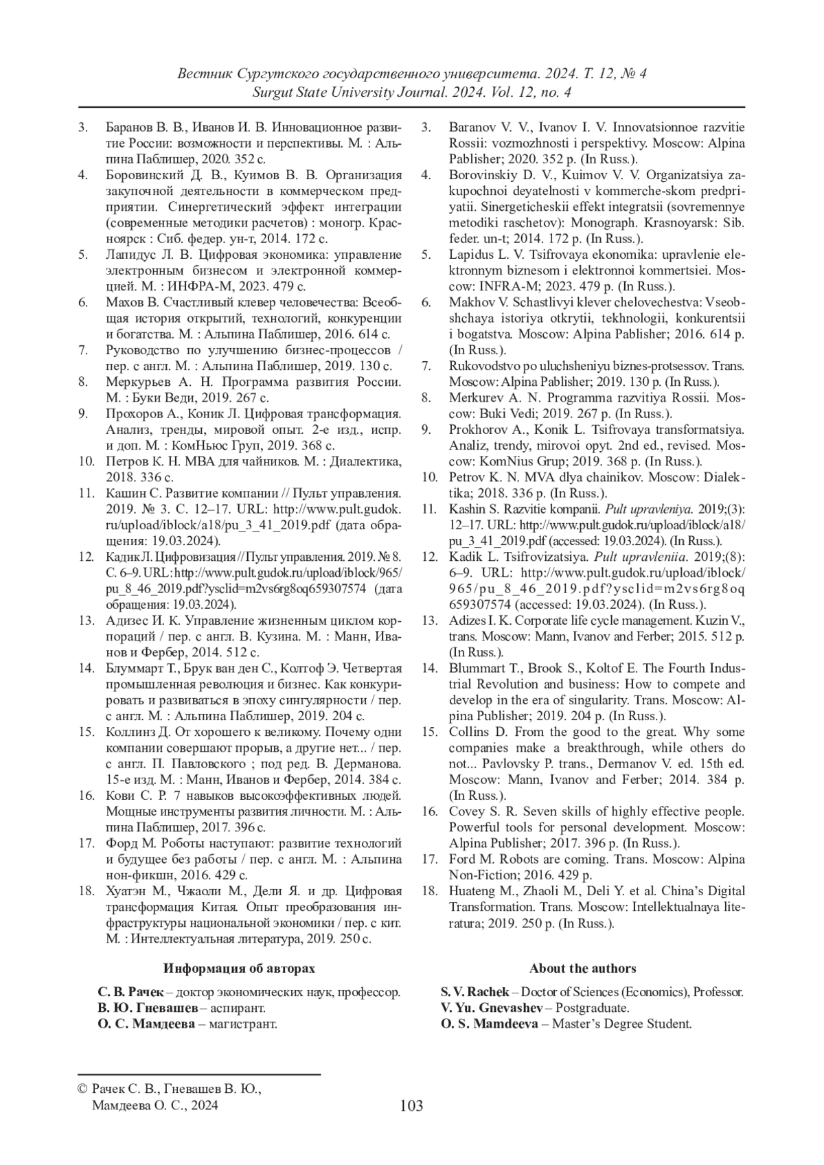 3. Баранов В. В., Иванов И. В. Инновационное развитие России: возможности и перспективы. М. : Альпина Паблишер, 2020. 352 с.