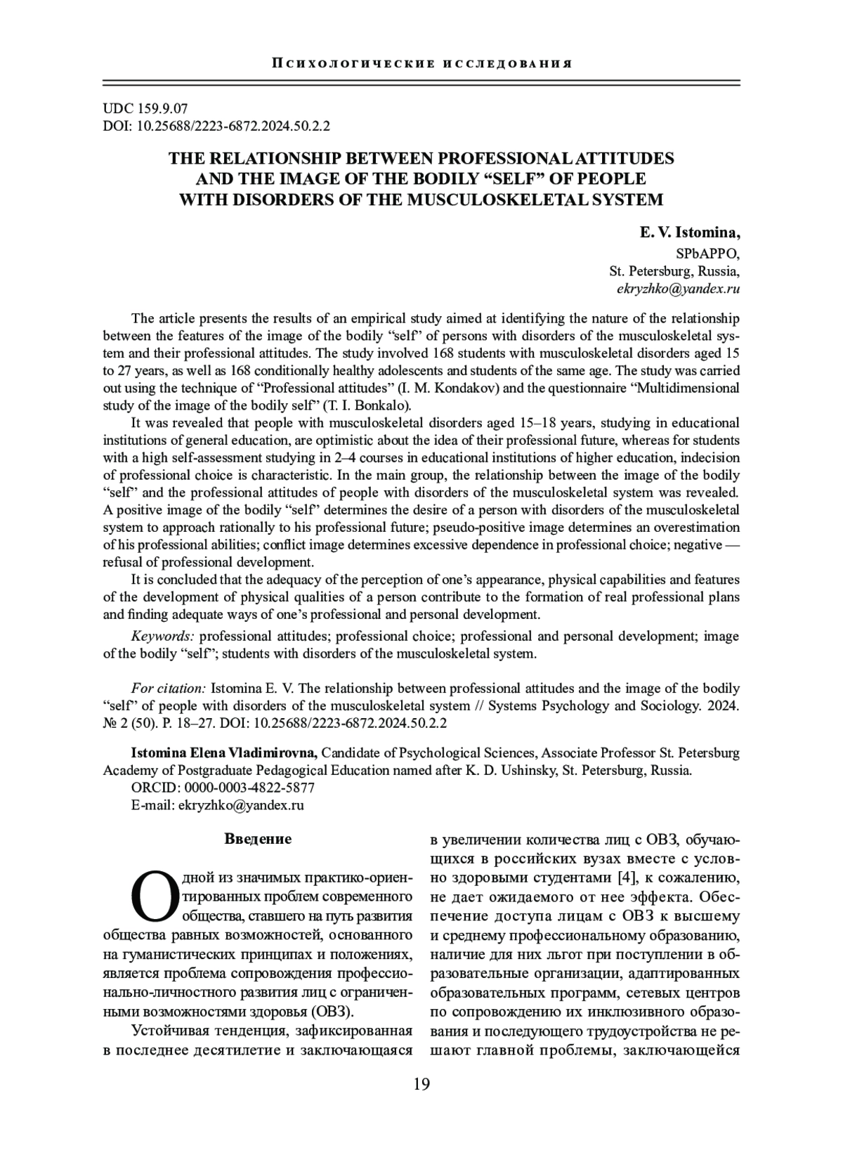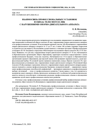 В статье представлены результаты эмпирического исследования, направленного на выявление характера взаимосвязи особенностей образа телесного Я лиц с нарушениями опорно-двигательного аппарата и их профессиональных установок. В исследовании приняли участие 168 обучающихся с нарушениями опорно-двигательного аппарата в возрасте от 15 до 27 лет, а также 168 условно здоровых подростков и студентов того же возраста. Исследование осуществлялось с помощью методики «Профессиональные установки» (И. М. Кондаков) и опросника «Многомерное исследование образа телесного Я» (Т. И. Бонкало). Выявлено, что для лиц с нарушениями опорно-двигательного аппарата 15-18 лет, обучающихся в образовательных организациях общего образования, характерен оптимизм в представлении о своем профессиональном будущем, тогда как студенты, обучающиеся на 2-4-м курсах в образовательных организациях высшего образования, при высокой оценке себя проявляют нерешительность, делая профессиональный выбор. В основной группе выявлена взаимосвязь между образом телесного Я и профессиональными установками лиц с нарушениями опорно-двигательного аппарата. Позитивный образ телесного Я обусловливает стремление личности с нарушениями опорно-двигательного аппарата рационально подходить к своему профессиональному будущему; псевдопозитивный - завышенную оценку своих профессиональных способностей; конфликтный - чрезмерную зависимость в профессиональном выборе; негативный - отказ от профессионального развития. Сделан вывод о том, что адекватность восприятия своего внешнего облика, физических возможностей и особенностей развития физических качеств личности способствуют становлению реальных профессиональных планов и нахождению адекватных путей своего профессионально-личностного развития.