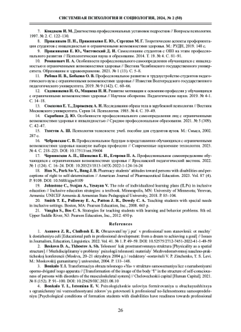 14. Скрябина Д. Ю. Особенности профессионального самоопределения лиц с ограниченными возможностями здоровья и инвалидностью // Среднее профессиональное образование. 2021. № 5 (309). С. 42-47. EDN: QCVKZY