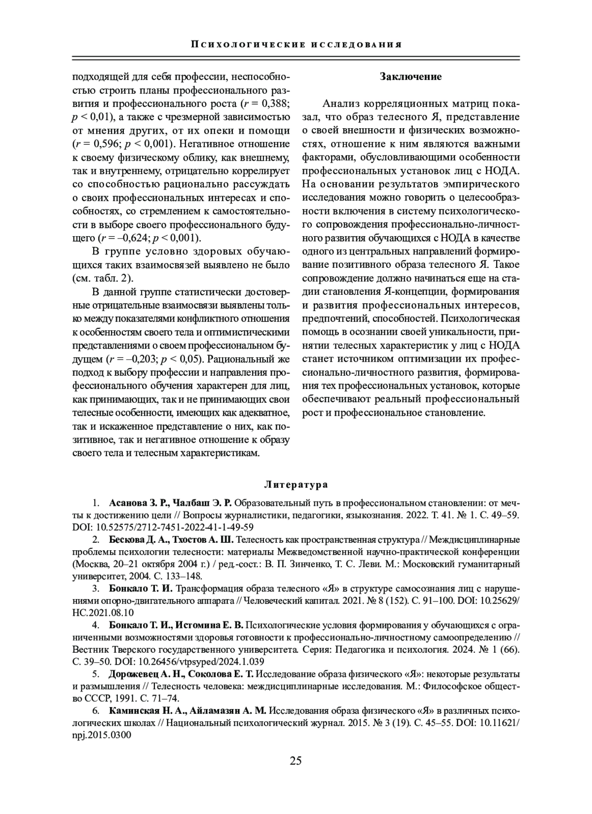 3. Бонкало Т. И. Трансформация образа телесного “Я” в структуре самосознания лиц с нарушениями опорно-двигательного аппарата // Человеческий капитал. 2021. № 8 (152). С. 91-100. 10.25629/ HC.2021.08.10. DOI: 10.25629/HC.2021.08.10 EDN: KRTNMR
