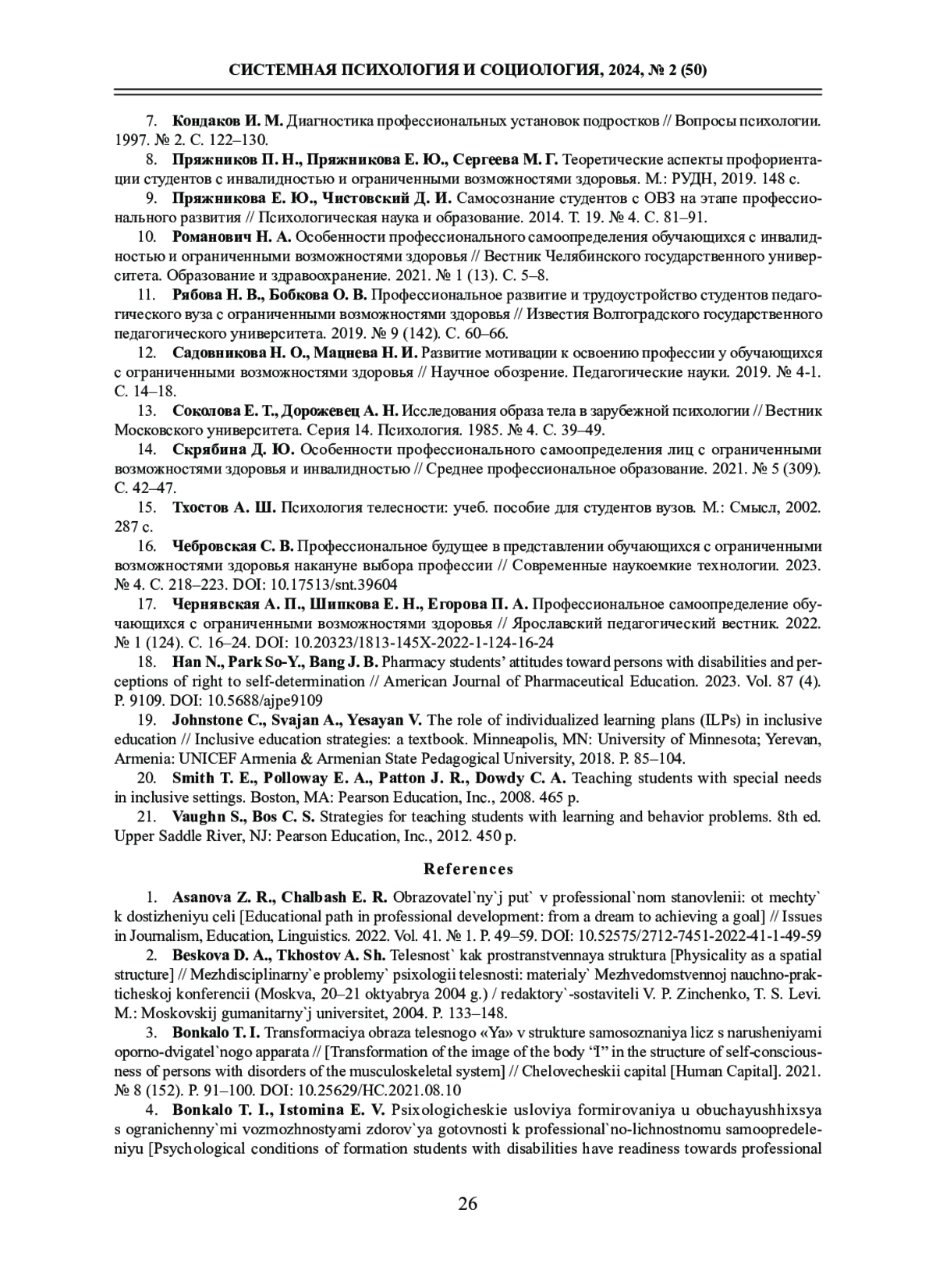 9. Пряжникова Е. Ю., Чистовский Д. И. Самосознание студентов с ОВЗ на этапе профессионального развития // Психологическая наука и образование. 2014. Т. 19. № 4. С. 81-91. EDN: TDYBWF