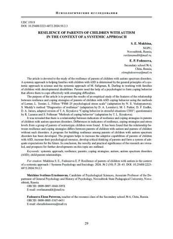 22. Parenting stress and resilience in parents of children with autism spectrum disorder (ASD) in southeast Asia: a systematic review / K. Ilias et al. // rontiers in Psychologi. 2018. Vol. 9. P. 280. DOI: 10.3389/fpsyg.2018.00280