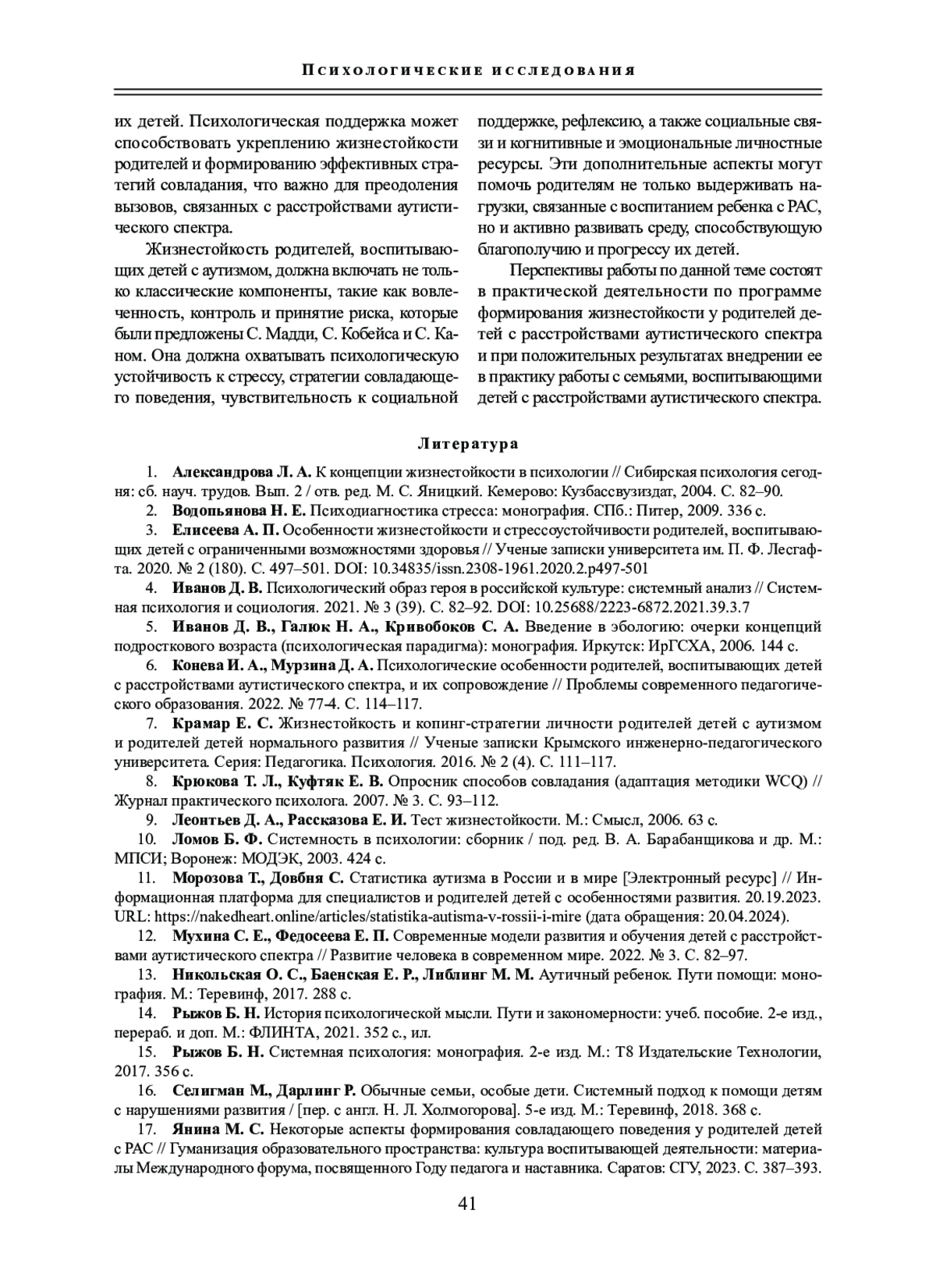 17. Янина М. С. Некоторые аспекты формирования совладающего поведения у родителей детей с РАС // Гуманизация образовательного пространства: культура воспитывающей деятельности: материалы Международного форума, посвященного Году педагога и наставника. Саратов: СГУ, 2023. С. 387-393. EDN: ADILDZ