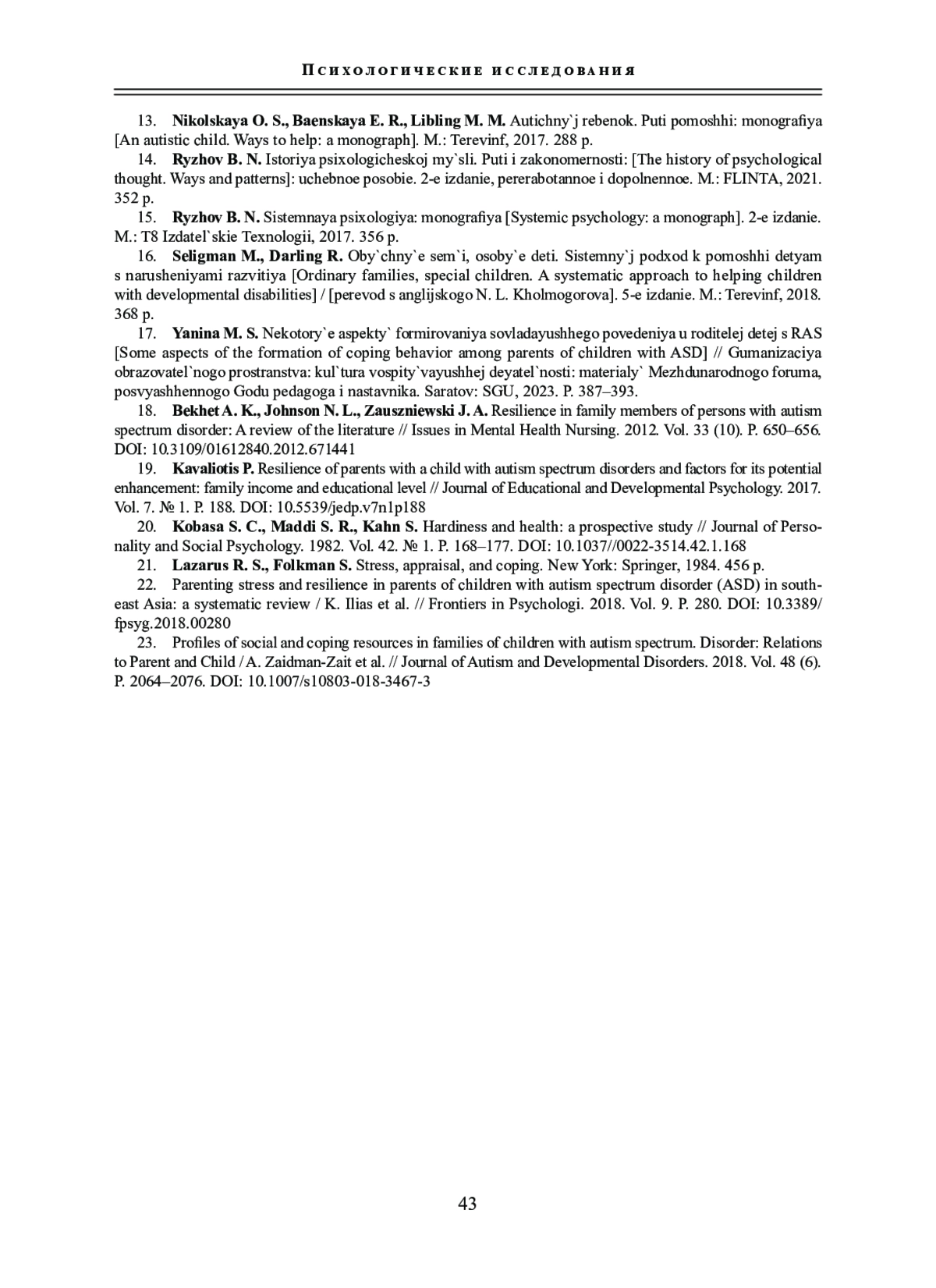 18. Bekhet A. K., Johnson N. L., Zauszniewski J. A. Resilience in family members of persons with autism spectrum disorder: A review of the literature // Issues in Mental Health Nursing. 2012. Vol. 33 (10). P. 650-656. DOI: 10.3109/01612840.2012.671441