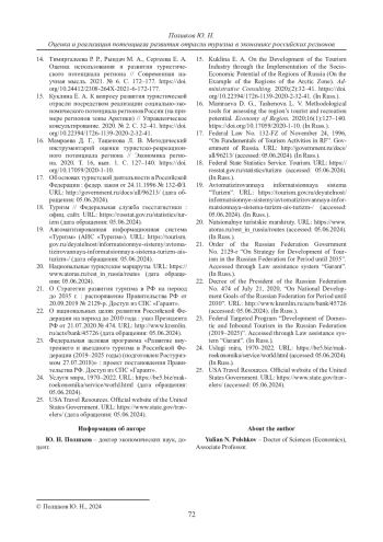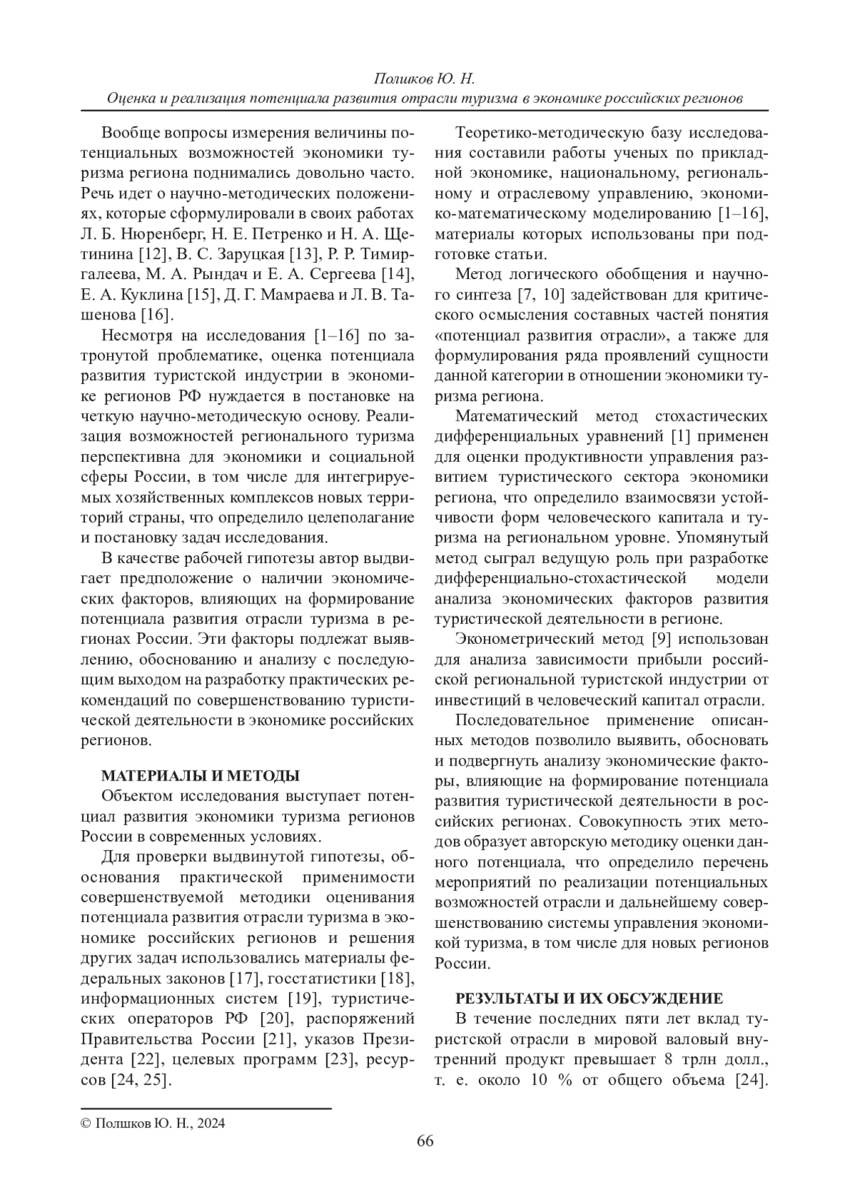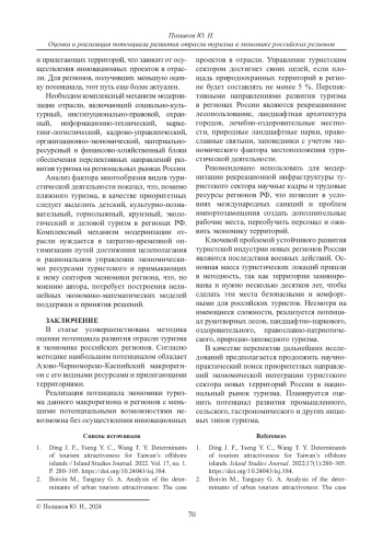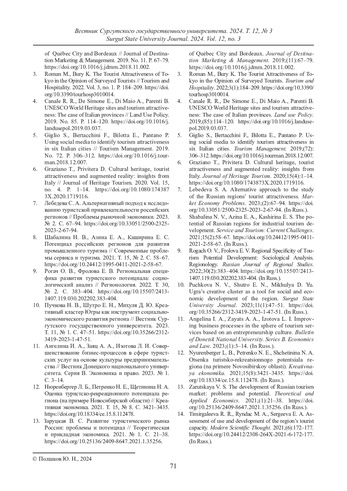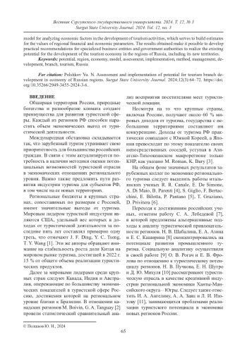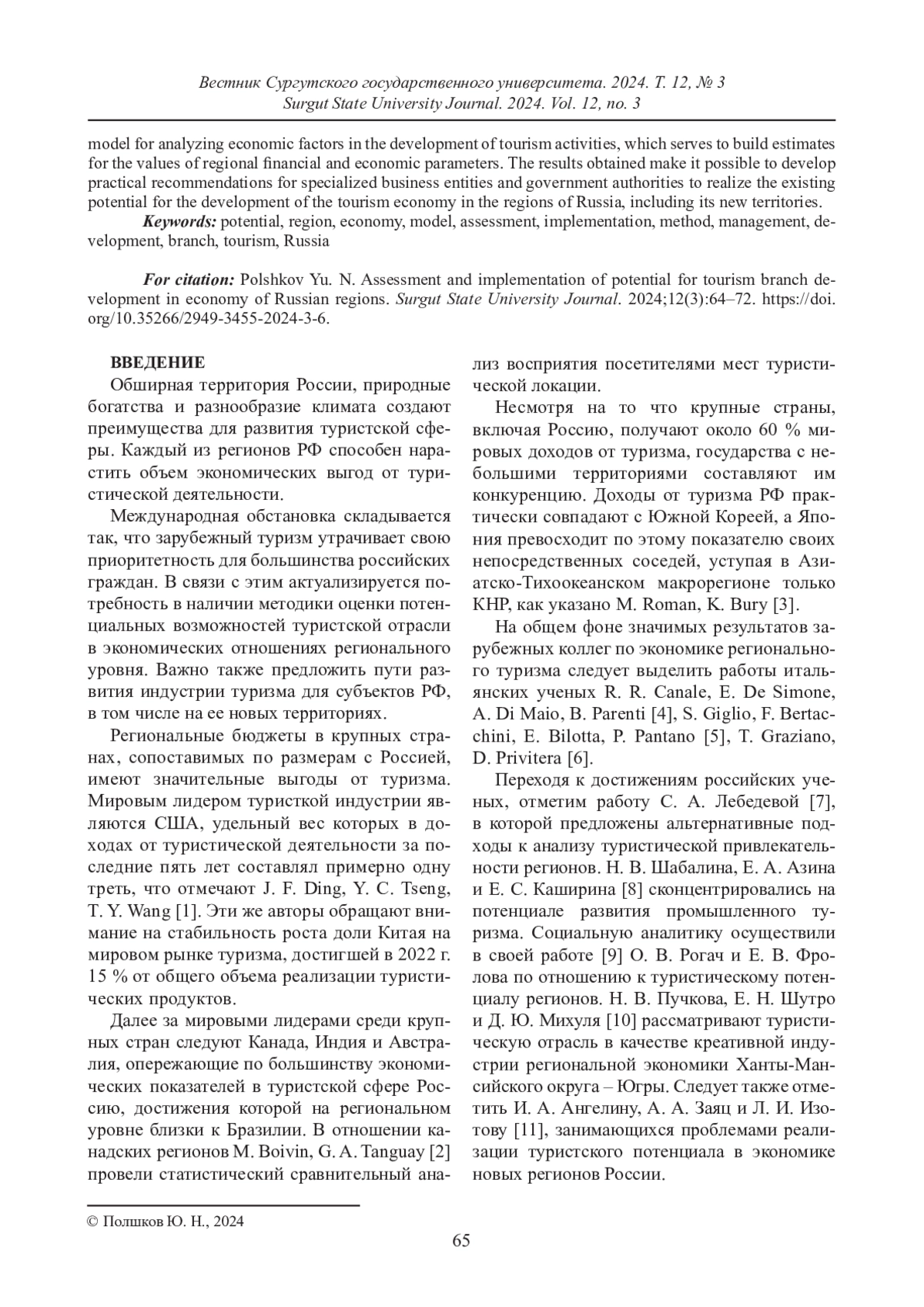 ПОЛШКОВ Ю. Н. ОЦЕНКА И РЕАЛИЗАЦИЯ ПОТЕНЦИАЛА РАЗВИТИЯ ОТРАСЛИ ТУРИЗМА В ЭКОНОМИКЕ РОССИЙСКИХ РЕГИОНОВ // ВЕСТНИК СУРГУТСКОГО ГОСУДАРСТВЕННОГО УНИВЕРСИТЕТА. 2024. ТОМ 12, № 3