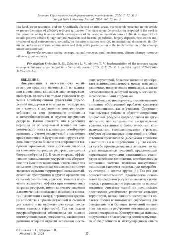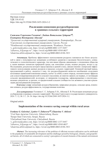 Проблема эффективного использования ресурсов становится все более актуальной в связи с популярностью концепции устойчивого развития и вызовами биологического, климатического и геополитического характера, тем или иным образом связанными с отношением общества к таким важным элементам природной среды, как земельные угодья, водные ресурсы, воздух и др. Исследование, результаты которого представлены в данной статье, связано именно с вопросами эффективного использования данных ресурсов в пределах сельских территорий. Основной научный вывод, предложенный в работе, сводится к тому, что ресурсосбережение является неизбежным следствием негативных проявлений изменения климата, влечет за собой, в свою очередь, положительные эффекты для сельхозтоваропроизводителей и сельского населения, во многом зависит, во-первых, от мотивации сельских предпринимателей, во-вторых, от инициатив государства, зафиксированных в институциональных документах, в-третьих, от предпочтений сельских сообществ и их активного участия в реализации рассматриваемой концепции.