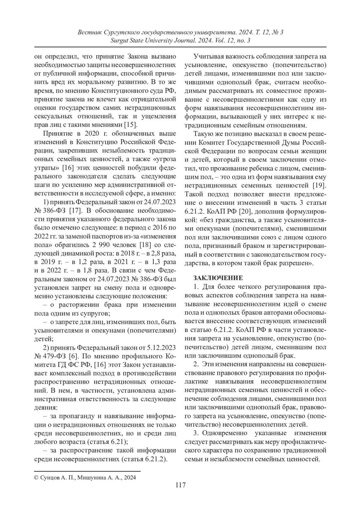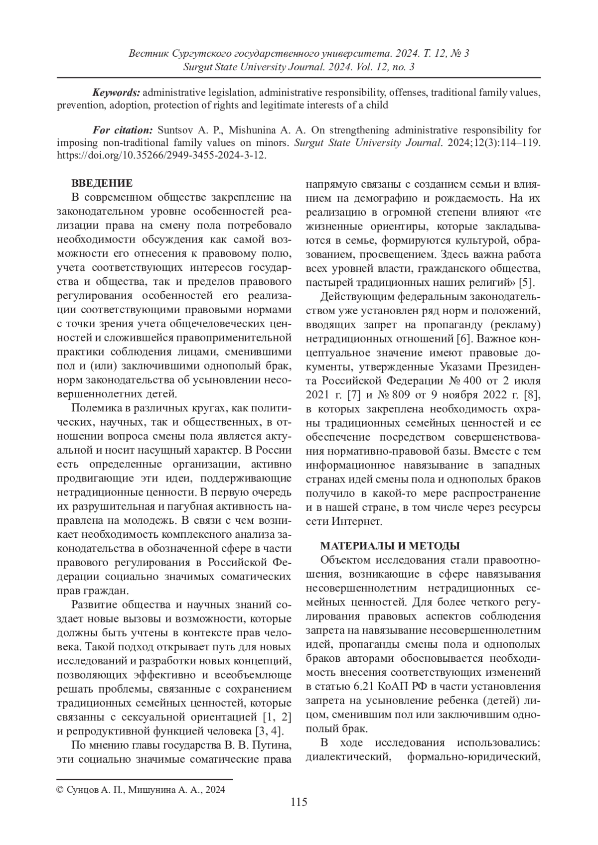 В статье обосновываются рекомендации по усилению мер административной ответственности за навязывание несовершеннолетним нетрадиционных семейных ценностей. В качестве научной методологии использовались: диалектический, формально-юридический, общенаучные методы (анализ, синтез), а также сравнительно-правовой метод. На основе анализа действующего законодательства и правоприменительной практики авторами предлагается для соблюдения запрета на навязывание несовершеннолетним идей, пропаганды смены пола и однополых браков внести соответствующие изменения в статью 6.21 Кодекса Российской Федерации об административных правонарушениях (КоАП РФ) в части установления запрета на усыновление ребенка (детей) лицом, сменившим пол.
