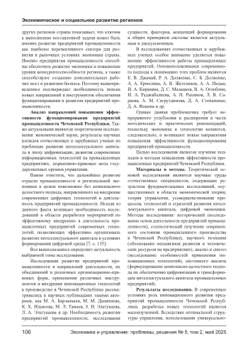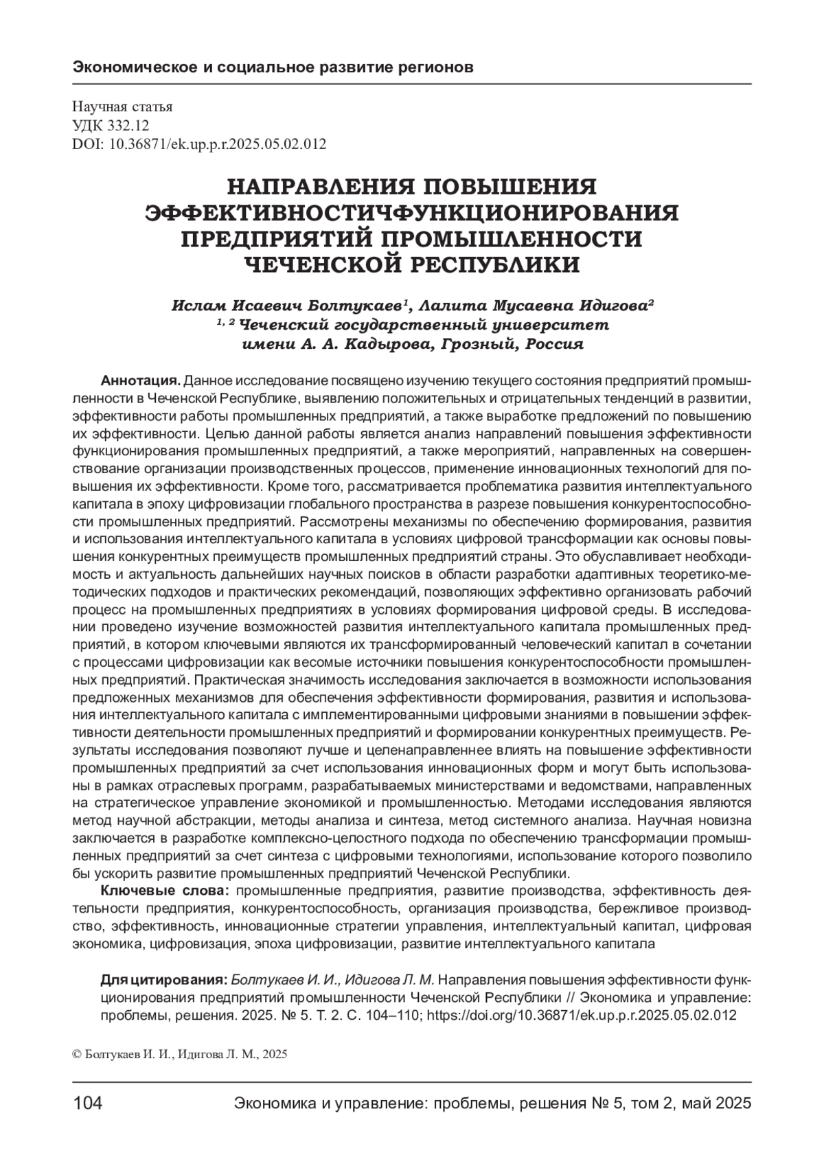 Целью данной работы является анализ направлений повышения эффективности функционирования промышленных предприятий, а также мероприятий, направленных на совершенствование организации производственных процессов, применение инновационных технологий для повышения их эффективности. Кроме того, рассматривается проблематика развития интеллектуального капитала в эпоху цифровизации глобального пространства в разрезе повышения конкурентоспособности промышленных предприятий. Рассмотрены механизмы по обеспечению формирования, развития и использования интеллектуального капитала в условиях цифровой трансформации как основы повышения конкурентных преимуществ промышленных предприятий страны. Это обуславливает необходимость и актуальность дальнейших научных поисков в области разработки адаптивных теоретико-методических подходов и практических рекомендаций, позволяющих эффективно организовать рабочий процесс на промышленных предприятиях в условиях формирования цифровой среды. В исследовании проведено изучение возможностей развития интеллектуального капитала промышленных предприятий, в котором ключевыми являются их трансформированный человеческий капитал в сочетании с процессами цифровизации как весомые источники повышения конкурентоспособности промышленных предприятий. Практическая значимость исследования заключается в возможности использования предложенных механизмов для обеспечения эффективности формирования, развития и использования интеллектуального капитала с имплементированными цифровыми знаниями в повышении эффективности деятельности промышленных предприятий и формировании конкурентных преимуществ. Результаты исследования позволяют лучше и целенаправленнее влиять на повышение эффективности промышленных предприятий за счет использования инновационных форм и могут быть использованы в рамках отраслевых программ, разрабатываемых министерствами и ведомствами, направленных на стратегическое управление экономикой и промышленностью. Методами исследования являются метод научной абстракции, методы анализа и синтеза, метод системного анализа. Научная новизна заключается в разработке комплексно-целостного подхода по обеспечению трансформации промышленных предприятий за счет синтеза с цифровыми технологиями, использование которого позволило бы ускорить развитие промышленных предприятий Чеченской Республики.